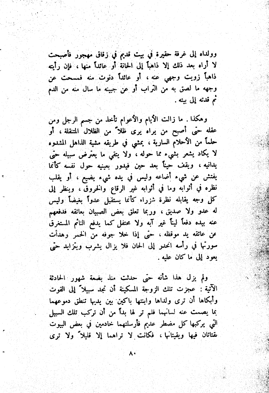 وَوَلَدَاهُ إِلَى غُرْفَة حَقِيرَة فِي بَيْت قَدِيم فِي زُقَاق مَهْجُور فَأَصْبَحَتْ لَا أَرَاهُ بَعْد ذَلِكَ إِلَّا ذَاهِبًا إِلَى اَلْحَانَة أَوْ عَائِدًا مِنْهَا فَإِنْ رَأَيْته ذَاهِبًا زويت وَجْهِي عَنْهُ أَوْ عَائِدًا دَنَوْت مِنْهُ فَمَسَحَتْ عَنْ وَجْهه مَا لَصِقَ بِهِ مِنْ اَلتُّرَاب أَوْ عَنْ جَبِينه مَا سَالَ مِنْهُ مِنْ اَلدَّم ثُمَّ قُدْته إِلَى بَيْته.