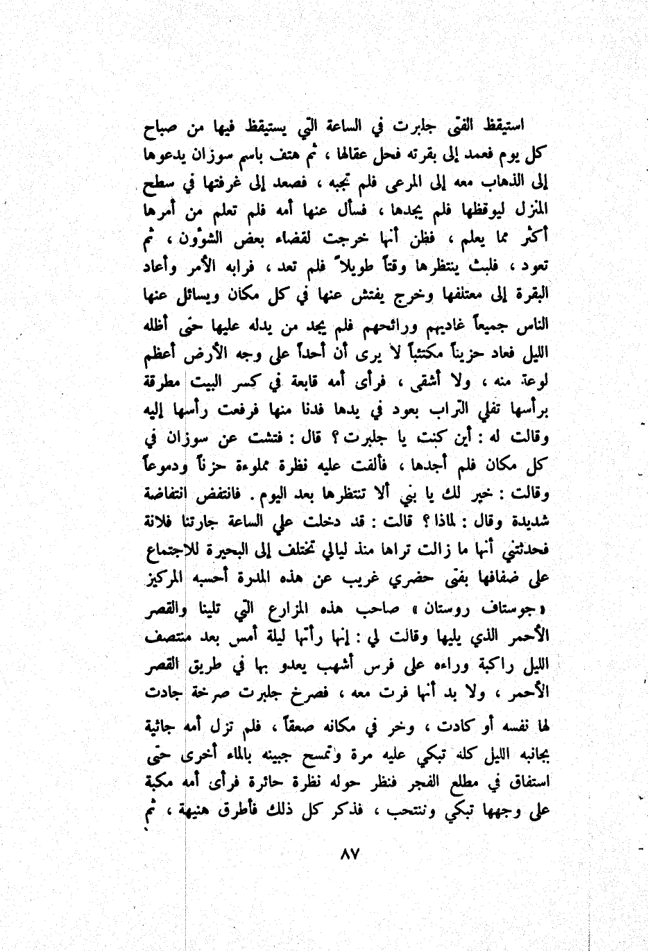 اِسْتَيْقَظَ اَلْفَتِيّ جلبرت فِي اَلسَّاعَة اَلَّتِي يَسْتَيْقِظ فِيهَا مِنْ صَبَاح كُلّ يَوْم فَعَمَدَ إِلَى بَقَرَته فَحَلَّ عِقَالهَا ثُمَّ هَتَفَ بِاسْم سُوزَان يَدْعُوهَا إِلَى اَلذَّهَاب مَعَهُ إِلَى اَلْمَرْعَى فَلَمْ تَجُبّهُ فَصَعِدَ إِلَى غُرْفَتهَا فِي سَطْح اَلْمَنْزِل لِيُوقِظهَا فَلَمْ يَجِدهَا فَسَأَلَ عَنْهَا أُمّه فَلَمْ تَعْلَم مَنْ أَمْرهَا أَكْثَر مِمَّا يَعْلَم فَظَنَّ أَنَّهَا خَرَجَتْ لِقَضَاء بَعْض اَلشُّؤُون ثُمَّ تَعُود فَلَبِثَ يَنْتَظِرهَا وَقْتًا طَوِيلًا فَلَمْ تَعُدْ فَرَابَهُ اَلْأَمْر وَأَعَادَ اَلْبَقَرَة إِلَى معتلفها وَخَرَجَ يُفَتِّش عَنْهَا فِي كُلّ مَكَان وَيُسَائِل عَنْهَا اَلنَّاس جَمِيعًا غاديهم ورائحهم فِلْمَيْ جَدّ مَنْ يَدُلّهُ عَلَيْهَا حَتَّى أَظَلَّهُ اَللَّيْل فَعَادَ حرينا مُكْتَئِبًا لَا يَرَى أَنَّ أَحَدًا عَلَى وَجْه اَلْأَرْض أَعْظَم لَوْعَة مِنْهُ وَلَا أَشْقَى أُمّه قَابِعَة فِي كَسْر اَلْبَيْت مِطْرَقَة بِرَأْسِهَا تفلي اَلتُّرَاب بِعُود فِي يَدهَا فَدَنَا مِنْهَا فَرَفَعَتْ رَأْسهَا إِلَيْهِ وَقَالَتْ لَهُ أَيْنَ كُنْت يَا جلبرت ? قَالَ فَتَّشْت عَنْ سُوزَان فِي كُلّ مَكَان فَلَمْ أَجِدهَا فَأَلْقَتْ عَلَيْهِ نَظْرَة مَمْلُوءَة حُزْنًا وَدُمُوعًا وَقَالَتْ خَيْر لَك يَا بَنِي أَلَّا تَنْتَظِرهَا بَعْد اَلْيَوْم فَانْتَفَضَ اِنْتِفَاضَة شَدِيدَة وَقَالَ لِمَاذَا قَالَتْ قَدْ دَخَلَتْ عَلَى اَلسَّاعَة جَارَتنَا فُلَانَة فَحَدَّثَتْنِي أَنَّهَا مَا زَالَتْ تَرَاهَا مُنْذُ لَيَالِي تَخْتَلِف إِلَى اَلْبُحَيْرَة لِلِاجْتِمَاعِ عَلَى ضِفَافهَا بِفَتِيّ حَضَرِيّ غَرِيب عَنْ هَذِهِ اَلْمُدِرَّة أَحْسَبهُ اَلْمَرْكَز جُوسْتَاف صَاحِب هَذِهِ اَلْمَزَارِع اَلَّتِي تَلِينَا وَالْقَصّ اَلْأَحْمَر اَلَّذِي يَلِيهَا وَقَالَتْ لِي إِنَّهَا رَأَتْهَا لَيْلَة أَمْس بَعْد مُنْتَصَف اَللَّيْل رَاكِبَة وَرَاءَهُ عَلَى فَرَس أَشْهَب يَعْدُو بِهَا فِي طَرِيق اَلْقَصْر اَلْأَحْمَر وَلَا بُدّ أَنَّهَا فَرَّتْ مَعَهُ فَصَرَخَ جلبرت صَرْخَة جَادَتْ لَهَا نَفْسه أَوْ كَادَتْ وَخِدْر فِي مَكَانه صَعِقَا فَلَمْ تَزَلْ أُمّه جَاثِيَة بِجَانِبِهِ اَللَّيْل كُلّه تَبْكِي عَلَيْهِ مَرَّة وَتَمْسَح جَبِينه بِالْمَاءِ أُخْرَى حَتَّى استفاق فِي مَطْلَع اَلْفَجْر فَنَظَرَ حَوْله نَظْرَة حَائِرَة فَرَأَى أُمّه مكبة عَلَى وَجْههَا تَبْكِي فَذَكَرَ كُلّ ذَلِكَ فَأَطْرُق هُنَيْهَة ثُمَّ
