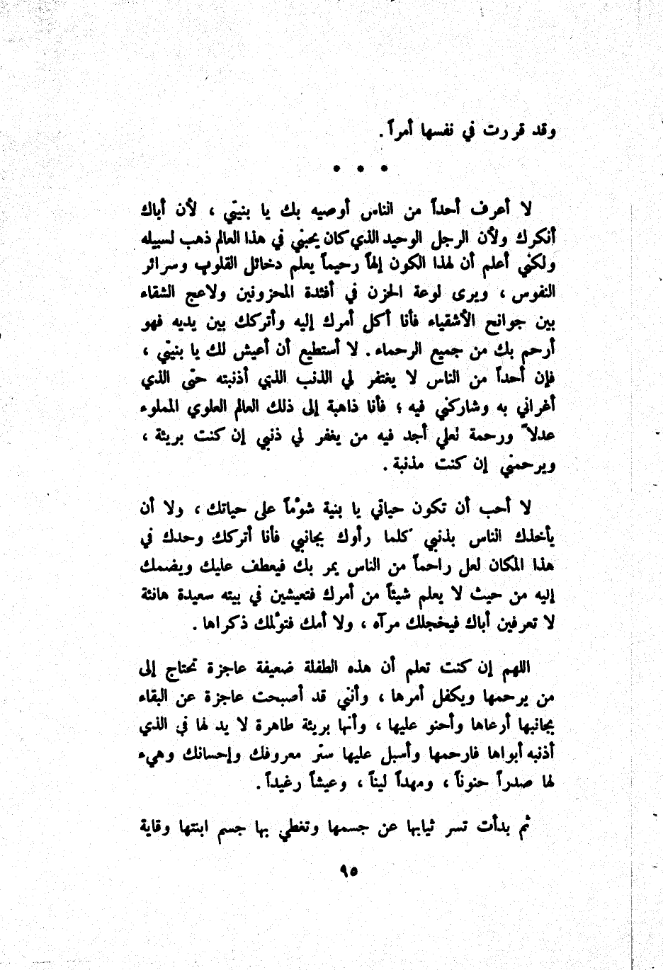 لَا أَعْرِف أَحَدًا مِنْ اَلنَّاس أُوصِيه بِك يَا بُنِيَ لِأَنَّ أَبَاك بِالْإِغْوَاءِ وَلِأَنَّ اَلرَّجُل اَلْوَحِيد اَلَّذِي كَانَ يُحِبّنِي فِي هَذَا اَلْعَالِم ذَهَب لِسَبِيلِهِ وَلَكِنِّي أَعْلَم أَنَّ لِهَذَا اَلْكَوْن إِلَهًا رَحِيمًا يَعْلَم دَخَائِل اَلْقُلُوب وَسَرَائِر اَلنُّفُوس وَيَرَى لَوْعَة اَلْحُزْن فِي أَفْئِدَة اَلْمَحْزُونِينَ ولاعج اَلشَّقَاء بَيْن جَوَانِح اَلْأَشْقِيَاء فَأَنَا أَكِلّ أَمْرك إِلَيْهِ وَأَتْرُكك بَيْن يَدَيْهِ فَهُوَ أَرْحَم بِك مِنْ جَمِيع اَلرُّحَمَاء لَا أَسْتَطِيع أَنْ أَعِيش لَك يَا بُنِّيَّتِي فَإِنَّ أَحَدًا مِنْ اَلنَّاس لَا يُغْتَفَر لِي اَلذَّنْب اَلَّذِي أذنبته حَتَّى اَلَّذِي أَغْرَانِي بِهِ وَشَارَكَنِي فِيهِ فَأَنَا ذَاهِبَة إِلَى ذَلِكَ اَلْعَالَم اَلْعُلْوِيّ اَلْمَمْلُوء عَدْلًا وَرَحْمَة لَعَلِّي أَجِد فِيهِ مَنْ يَغْفِر لِي ذَنْبِي إِنْ كُنْت بَرِيئَة وَيَرْحَمنِي إِنْ كُنْت مُذْنِبَة.