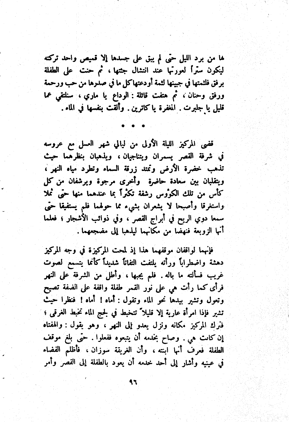 لَهَا مِنْ بَرْد اَللَّيْل حَتَّى لَمْ يُبْقَ عَلَى جَسَدهَا إِلَّا قَمِيص وَاحِد تَرِكَته لِيَكُونَ سَتْرًا لِعَوْرَتِهَا عِنْد اِنْتِشَال جُثَّتهَا ثُمَّ حَنَّتْ عَلَى اَلطِّفْلَة بِرِفْق فَلَثَمَتْهَا فِي جَبِينهَا لثمة أَوْدَعَتْهَا كُلّ مَا فِي صَدْرهَا مِنْ حُبّ وَرَحْمَة وَرِفْق وَحَنَان ثُمَّ هَتَفَتْ قَائِلَة اَلْوَدَاع يَا مَارِي سَنُلْقِي عَمَّا قَلِيل يَا جلبرت اَلْمَغْفِرَة يَا كَاتْرِين وَأَلْقَتْ بِنَفْسِهَا فِي اَلْمَاء.