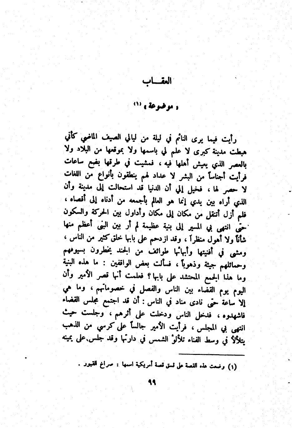 رَأَيْت فِيمَا يَرَى اَلنَّائِم فِي لَيْلَة مِنْ لَيَالِي اَلصَّيْف اَلْمَاضِي كَأَنِّي هَبَطْت مَدَنِيَّة كُبْرَى لَا عِلْم لِي بِاسْمِهَا وَلَا بِمَوْقِعِهَا مِنْ اَلْبِلَاد وَلَا بِالْعَصْرِ اَلَّذِي يَعِيش أَهْلهَا فِيهِ فَمَشَيْت فِي طُرُقهَا بِضْع سَاعَات فَرَأَيْت أَجْنَاسًا مِنْ اَلْبَشَر لَا عِدَاد لَهُمْ يَنْطِقُونَ بِأَنْوَاع مِنْ اَللُّغَات لَا حَصْر لَهَا فَخُيِّلَ إِلَيَّ أَنَّ اَلدُّنْيَا قَدْ اِسْتَحَالَتْ إِلَى مَدَنِيَّة وَأَنَّ اَلَّذِي أَرَاهُ بَيْن يَدِي إِنَّمَا هُوَ اَلْعَالِم بِأَجْمَعِهِ مِنْ أَدْنَاهُ إِلَى أَقْصَاهُ فَلَمْ أَزَلْ أَتَنَقَّل مِنْ مَكَان إِلَى مَكَان وَأُدَاوِل بَيْن اَلْحَرَكَة وَالسُّكُون حَتَّى اِنْتَهَى بِي اَلْمُسَيَّر إِلَى بِنْيَة عَظِيمَة لَمْ أَرَ بَيْن اَلنَّبِيّ أَعْظَم مِنْهَا شَأْنًا وَلَا أُهَوِّل مَنْظَرًا وَقَدْ اِزْدَحَمَ عَلَى بَابهَا خَلْق كَثِير مِنْ اَلنَّاس وَمَشَى فِي أَفْنَيْتهَا وأبهائها طَوَائِف مِنْ اَلْجُنْد يُخْطِرُونَ بِسُيُوفِهِمْ وحمائلهم جِيئَة وذهوبا فَسَأَلَتْ بَعْض اَلْوَاقِفِينَ مَا هَذِهِ اَلْبِنْيَة وَمَا هَذَا اَلْجَمْع اَلْمُحْتَشِد عَلَى بَابهَا فَعَلِمَتْ أَنَّهَا قَصْر اَلْأَمِير وَأَنْ اَلْيَوْم يَوْم اَلْقَضَاء بَيْن اَلنَّاس وَالْفَصْل فِي خُصُومَاتهمْ وَمَا هِيَ إِلَّا سَاعَة حَتَّى نَادَى مُنَادٍ فِي اَلنَّاس أَنَّ قَدْ اِجْتَمَعَ مَجْلِس اَلْقَضَاء فَاشْهَدُوهُ فَدَخْل اَلنَّاس وَدَخَلَتْ عَلَى أَثَرهمْ وَجَلَسَتْ حَيْثُ اِنْتَهَى بِي اَلْمَجْلِس فَرَأَيْت جَالِسًا عَلَى كُرْسِيّ مِنْ اَلذَّهَب يَتَلَأْلَأ فِي وَسَط اَلْفَنَاء تَلَأْلُؤ اَلشَّمْس فد دَارَتْهَا وَقَدْ جَلَسَ عَلَى يَمِينه