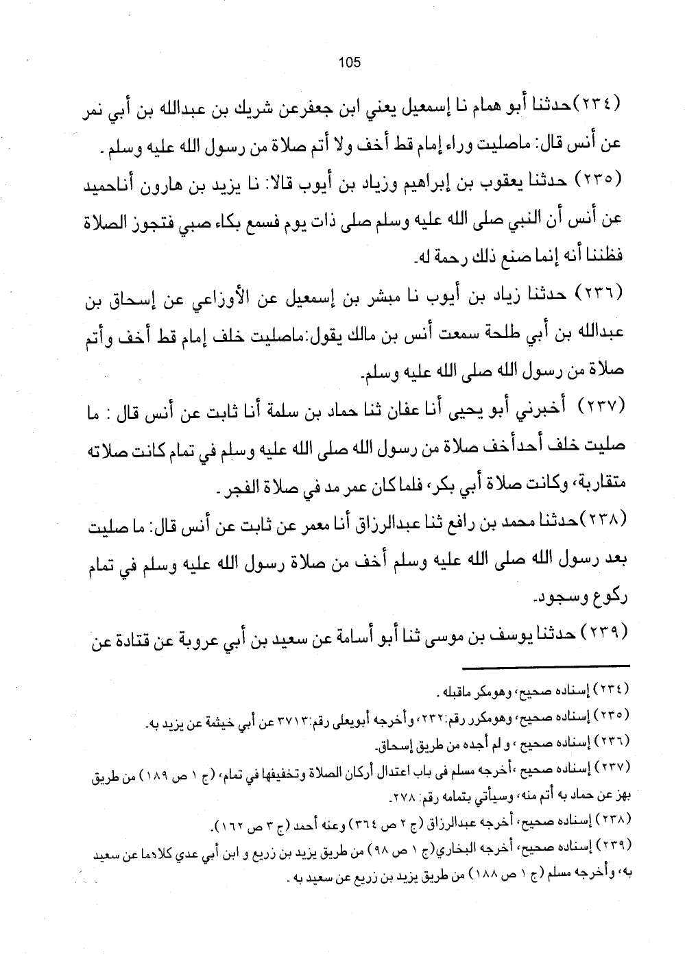 234 - حَدَّثَنَا أَبُو هَمَّامٍ ثَنَا إِسْمَاعِيلُ يَعْنِي ابْنَ جَعْفَرٍ عَنْ شَرِيكِ بْنِ عَبْدِ اللَّهِ بْنِ أَبِي نَمِرٍ عَنْ أَنَسٍ قَالَ: مَا صَلَّيْتُ وَرَاءَ إِمَامٍ قَطُّ أَخَفَّ وَلا أَتَمَّ صَلاةً مِنْ رَسُول الله عَلَيْهِ وَسلم.