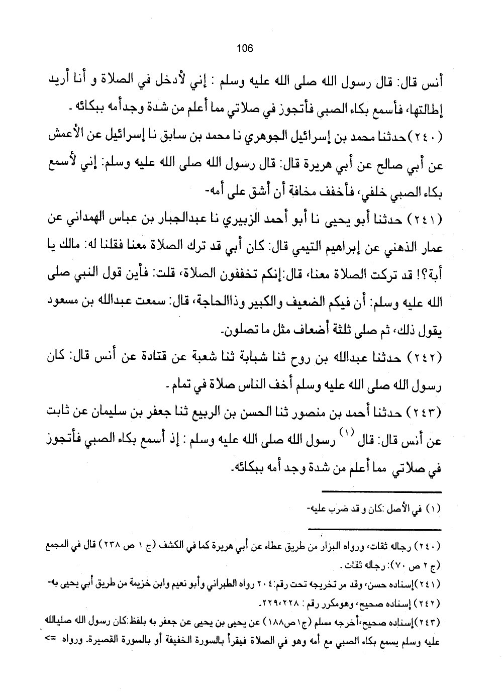 [243] إِسْنَاده صَحِيح، أخرجه مُسلم (ج1 ص188) عَن يحيى بن يحيى عَن جَعْفَر بِهِ بِلَفْظ: كَانَ رَسُول الله صَلَّى اللهُ عَلَيْهِ وَسَلَّمَ يسمع بكاء الصَّبِي مَعَ أمه وَهُوَ فِي الصَّلَاة فيقرا بالسورة الْخَفِيفَة أَو بالسورة القصيرة. رَوَاهُ =