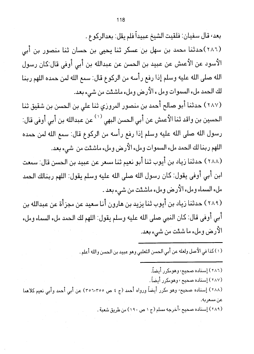 287 - حَدَّثَنَا أَبُو صَالِحٍ أَحْمَدُ بْنُ مَنْصُور الْمروزِي ثناعلي بْنُ الْحَسَنِ بْنِ شَفِيقٍ ثَنَا الْحُسَيْنُ بْنُ وَاقِدٍ ثَنَا الأَعْمَشُ عَنْ أبي الْحسن الْبَهِي (1) عَنْ عَبْدِ اللَّهِ بْنِ أَبِي أَوْفَى قَالُ: رَسُولُ اللَّهِ صَلَّى اللهُ عَلَيْهِ وَسَلَّمَ إِذَا رَفَعَ رَأْسَهُ مِنَ الرُّكوع قَالَ: سَمِعَ اللَّهُ لِمَنْ حَمِدَهُ اللَّهُمَّ رَبَّنَا لَكَ الْحَمْدُ مِلْءَ السَّمَوَاتِ وَالأَرْضِ مِلْءَ مَا شِئْتَ مِنْ شَيْءٍ بَعْدُ.