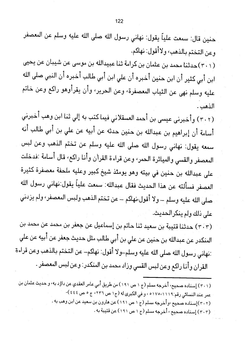 302 - وَأَخْبَرَنِي عِيسَى بْنُ أَحْمَدَ الْعَسْقَلانِيُّ فِيمَا كَتَبَ بِهِ إِلَيَّ ثَنَا ابْنُ وَهْبٍ أَخْبَرَنِي أُسَامَةُ أَنَّ إِبْرَاهِيمَ بْنَ عَبْدِ اللَّهِ بْنِ حُنَيْنٍ حَدَّثَهُ عَنْ أَبِيهِ عَنْ عَلِيِّ بْنِ أَبِي طَالِبٍ أَنَّهُ سَمِعَهُ، يَقُولُ: نَهَانِي رَسُولُ اللَّهِ صَلَّى اللهُ عَلَيْهِ وَسَلَّمَ عَنْ تَخَتُّمِ الذَّهَبِ وَعَنْ لُبْسِ الْمُعَصْفَرِ وَالْقِسِيِّ وَالْمَيَاثِرَةِ الْحُمْرِ، وَعَنْ قِرَاءَةِ الْقُرْآنِ وَأَنَا رَاكِعٌ، قَالَ أُسَامَةُ: فَدَخَلْتُ عَلَى عَبْدِ اللَّهِ بْنِ حُنَيْنٍ فِي بَيْتِهِ وَهُوَ يَوْمَئِذٍ شَيْخٌ كَبِيرٌ وَعَلَيْهِ مِلْحَفَةٌ مُعَصْفَرَةٌ كَثِيرَةُ الْعُصْفُرِ فَسَأَلْتُهُ عَنْ هَذَا الْحَدِيثِ فَقَالَ عَبْدُ اللَّهِ: سَمِعْتُ عَلِيًا يَقُولُ: نَهَانِي رَسُولُ اللَّهِ صَلَّى اللهُ عَلَيْهِ وَسَلَّمَ - وَلا أَقُولُ: نَهَاكُمْ - عَنْ تَخَتُّمِ الذَّهَبِ وَلُبْسِ الْمُعَصْفَرِ، وَلَمْ يَزِدْنِي عَلَى ذَلِكَ وَلَمْ يُنْكِرِ الْحَدِيثَ.