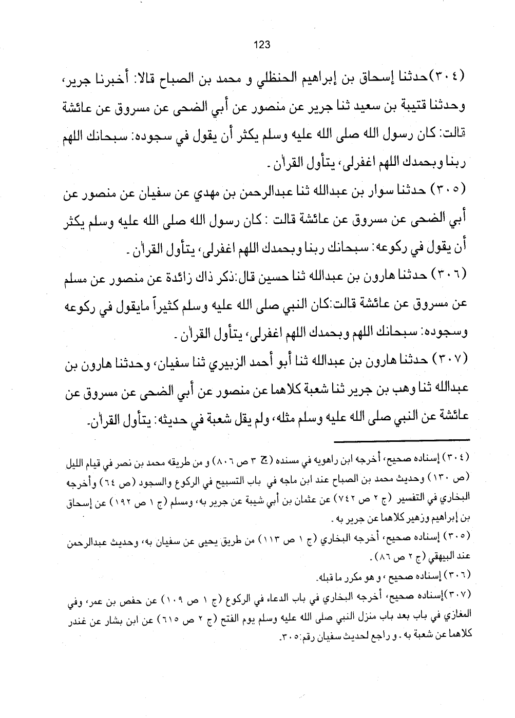 304 - حَدَّثَنَا إِسْحَاقُ بْنُ إِبْرَاهِيمَ الْحَنْظَلِيُّ وَمُحَمَّدُ بْنُ الصَّبَّاحِ قَالا: أَخْبَرَنَا جَرِيرٌ، وَحَدَّثَنَا قُتَيْبَةُ بْنُ سَعِيدٍ ثَنَا جَرِيرٌ عَنْ مَنْصُورٍ عَنْ أَبِي الضُّحَى عَنْ مَسْرُوقٍ عَنْ عَائِشَةَ قَالَتْ: كَانَ رَسُولُ اللَّهِ صَلَّى اللهُ عَلَيْهِ وَسَلَّمَ يُكْثِرُ أَنْ يَقُولَ فِي سُجُودِهِ: سُبْحَانَكَ اللَّهُمَّ رَبَّنَا وَبِحَمْدِكَ اللَّهُمَّ اغْفِرْ لِي، يَتَأَوَّلُ الْقُرْآنَ.