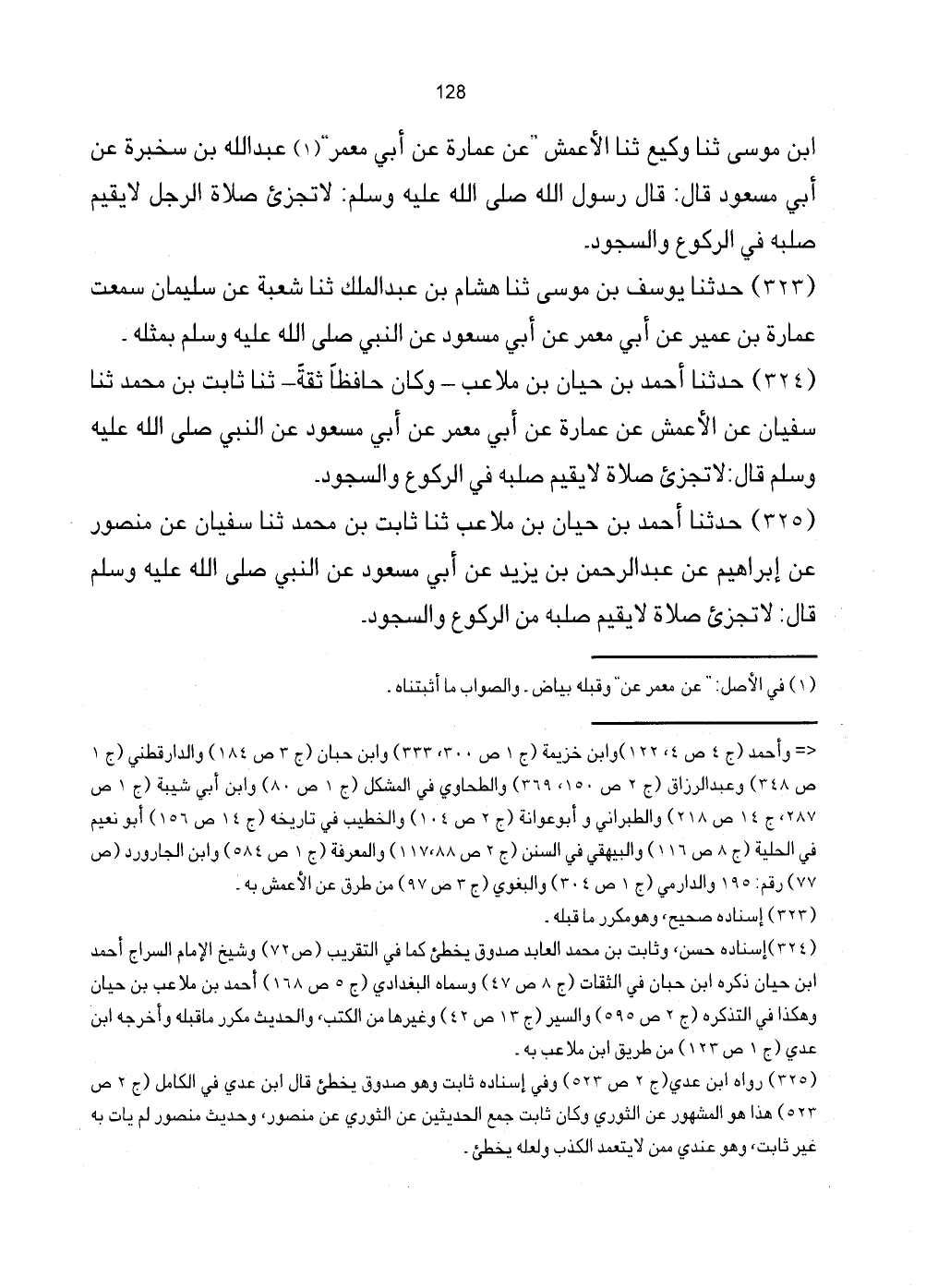 [324] إِسْنَاده حسن، وثابت بن مُحَمَّد العابد صَدُوق يُخطئ كَمَا فِي التَّقْرِيب (ص72) وَشَيخ الإِمَام السراج أَحْمد ابْن حَيَّان ذكره ابْن حبَان فِي الثِّقَات (ج8 ص47) وَسَماهُ الْبَغْدَادِيّ (ج5 ص168) أَحْمد بن ملاعب بن حَيَّان وَهَكَذَا فِي التَّذْكِرَة (ج2 ص595) وَالسير (ج13 ص42) وَغَيرهَا من الْكتب، والْحَدِيث مُكَرر مَا قبله وَأخرجه ابْن عدي (ج1 ص123) من طَرِيق ابْن ملاعب بِهِ.