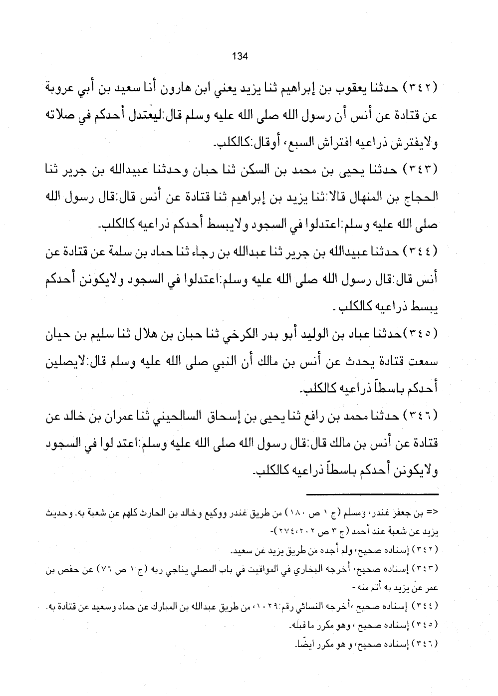 342 - حَدَّثَنَا يَعْقُوبُ بْنُ إِبْرَاهِيمَ ثَنَا يَزِيدُ يَعْنِي ابْنَ هَارُونَ أَنَا سَعِيدُ بْنُ أَبِي عَرُوبَةَ عَنْ قَتَادَةَ عَنْ أَنَسٍ أَنّ رَسُولَ اللَّهِ صَلَّى اللهُ عَلَيْهِ وَسَلَّمَ قَالَ: لَيَعْتَدِلَ أَحَدُكُمْ فِي صَلاتِهِ وَلا يَفْتَرِشُ ذِرَاعَيْهِ افْتِرَاشَ السُّبُعِ، أَوْ قَالَ: كَالْكَلْبِ.