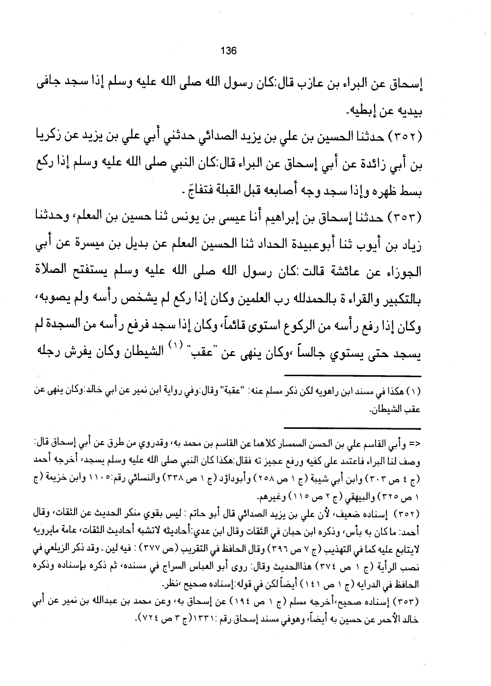 353 - حَدَّثَنَا إِسْحَاقُ بْنُ إِبْرَاهِيمَ أَنَا عِيسَى بْنُ يُونُسَ ثَنَا حُسَيْنُ بْنُ الْمُعَلِّمِ، وَحَدَّثَنَا زِيَادُ بْنُ أَيُّوبَ ثَنَا أَبُو عُبَيْدَةَ الْحَدَّادُ ثَنَا الْحُسَيْنُ الْمُعَلِّمُ عَنْ بُدَيْلِ بْنِ مَيْسَرَةَ عَن أبي الجوازء عَنْ عَائِشَةَ قَالَتْ: كَانَ رَسُولُ اللَّهِ صَلَّى اللهُ عَلَيْهِ وَسَلَّمَ يَسْتَفْتِحُ الصَّلاةَ بِالتَّكْبِيرِ وَالْقِرَاءَة بِالْحَمْد لِلَّهِ رَبِّ الْعَالَمِينَ وَكَانَ إِذَا رَكَعَ لَمْ يُشْخِصْ رَأْسَهُ وَلَمْ يُصَوِّبْهُ، وَكَانَ إِذَا رَفَعَ رَأْسَهُ مِنَ الرُّكُوعِ اسْتَوَى قَائِمًا، وَكَانَ إِذَا سَجَدَ فَرَفَعَ رَأْسَهُ مِنَ السَّجْدَةِ لَمْ يَسْجُدْ حَتَّى يَسْتَوِي جالياً، وَكَانَ يَنْهَى عَنْ "عُقُبِ" (1) الشَّيْطَانِ وَكَانَ يَفْرِشُ رِجْلَهُ