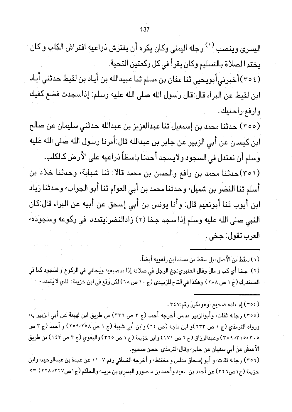 356 - حَدثنَا محد بْنُ رَافِعٍ وَالْحَسَنُ بْنُ مُحَمَّدٍ قَالا: ثَنَا شَبَابَةُ، وَحَدَّثَنَا خَلادُ بْنُ أَسْلَمَ ثَنَا النَّضْرُ بْنُ شُمَيْلٍ، وَحَدَّثَنَا مُحَمَّدُ بْنُ أَبِي الْعَوَّامِ ثَنَا أَبُو الْجَوَّابِ، وَحَدَّثَنَا زِيَادُ ابْن أَيُّوبَ ثَنَا أَبُو نعيم قا: وَأَنَا يُونُسُ بْنُ أَبِي إِسْحَاقَ عَنْ أَبِيهِ عَنِ الْبَرَاءِ قَالَ: كَانَ النَّبِيُّ صَلَّى اللهُ عَلَيْهِ وَسَلَّمَ إِذَا سجد جخا (2) ذازد النَّضْرُ. يَمْتَدُّ فِي رُكُوعه وَسُجُوده، الْعرق تَقُولُ: جَخَى.