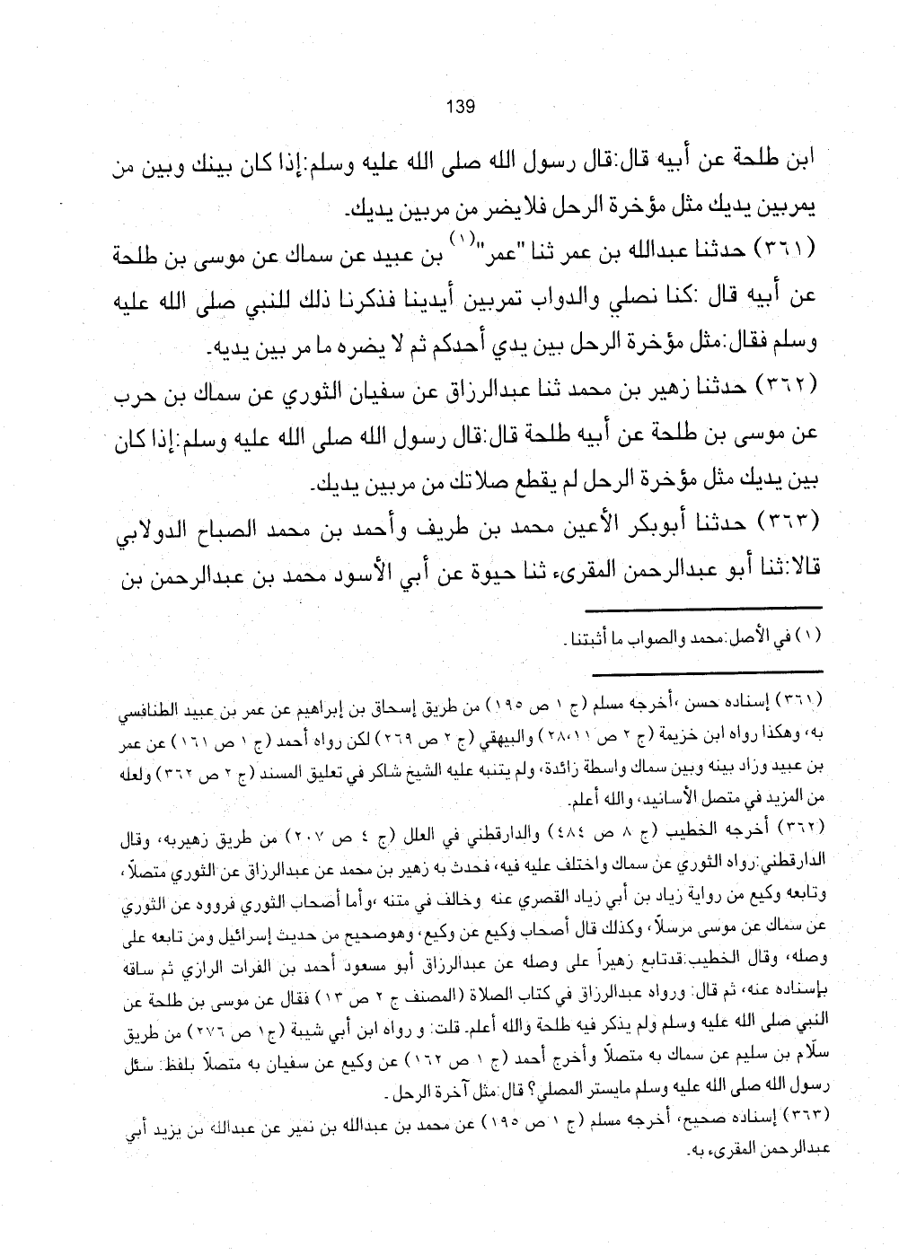 [362] أخرجه الْخَطِيب (ج8 ص484) وَالدَّارقطني فِي الْعِلَل (ج4 ص207) من طَرِيق زُهَيْر بِهِ، وَقَالَ الدَّارقطني: رَوَاهُ الثَّوْريّ عَن سماك وَاخْتلف عَلَيْهِ فِيهِ، فَحدث بِهِ زُهَيْر بن مُحَمَّد عَن عبد الرَّزَّاق عَن الثَّوْريّ مُتَّصِلا، وَتَابعه وَكِيع من رِوَايَة زِيَاد بن أبي زِيَاد القصري عَنهُ وَخَالف فِي مَتنه، وَأما أَصْحَاب الثَّوْريّ فَرَوَوْه عَن الثَّوْريّ عَن سماك عَن مُوسَى مُرْسلا، وَكَذَلِكَ قَالَ أَصْحَاب وَكِيع عَن وَكِيع، وَهُوَ صَحِيح من حَدِيث إِسْرَائِيل وَمن تَابعه على وَصله، وَقَالَ الْخَطِيب: قد تَابع زهيراً على وَصله عَن عبد الرَّزَّاق أَبُو مَسْعُود أَحْمد بن الْفُرَات الرَّازِيّ ثمَّ سافه بِإِسْنَادِهِ عَنهُ، ثمَّ قَالَ: وَرَوَاهُ عبد الرَّزَّاق فِي كتاب الصَّلَاة (المُصَنّف ج2 ص13) فَقَالَ عَن مُوسَى بن طَلْحَة عَن النَّبِي صَلَّى اللهُ عَلَيْهِ وَسَلَّمَ وَلم يذكر فِيهِ طَلْحَة وَالله أعلم. قلت: وَرَوَاهُ ابْن أبي شيبَة (ج1 ص276) من طَرِيق سَلام بن سليم عَن سماك بِهِ مُتَّصِلا وَأخرج أَحْمد (ج1 ص162) عَن وَكِيع عَن سُفْيَان بِهِ مُتَّصِلا بِلَفْظ: سُئِلَ رَسُول الله صَلَّى اللهُ عَلَيْهِ وَسَلَّمَ مَا يتسر الْمُصَلِّي؟ قَالَ: مثل آخِرَة الرحل.
