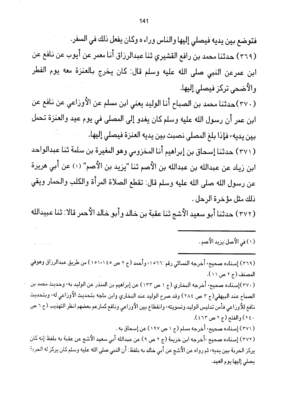 [372] إِسْنَاده صَحِيح، أخرجه ابْن خُزَيْمَة (ج2 ص9) عَن عبد الله أبي سعيد الْأَشَج عَن عقبَة بِهِ بِلَفْظ: إِنَّه كَانَ يركز الحربة بَين يَدَيْهِ، ثمَّ رَوَاهُ عَن الْأَشَج عَن أبي خَالِد بِهِ بِلَفْظ: أَن النَّبِي صَلَّى اللهُ عَلَيْهِ وَسَلَّمَ كَانَ يركز لَهُ الْحُرِّيَّة يُصَلِّي إِلَيْهَا يَوْم الْعِيد.