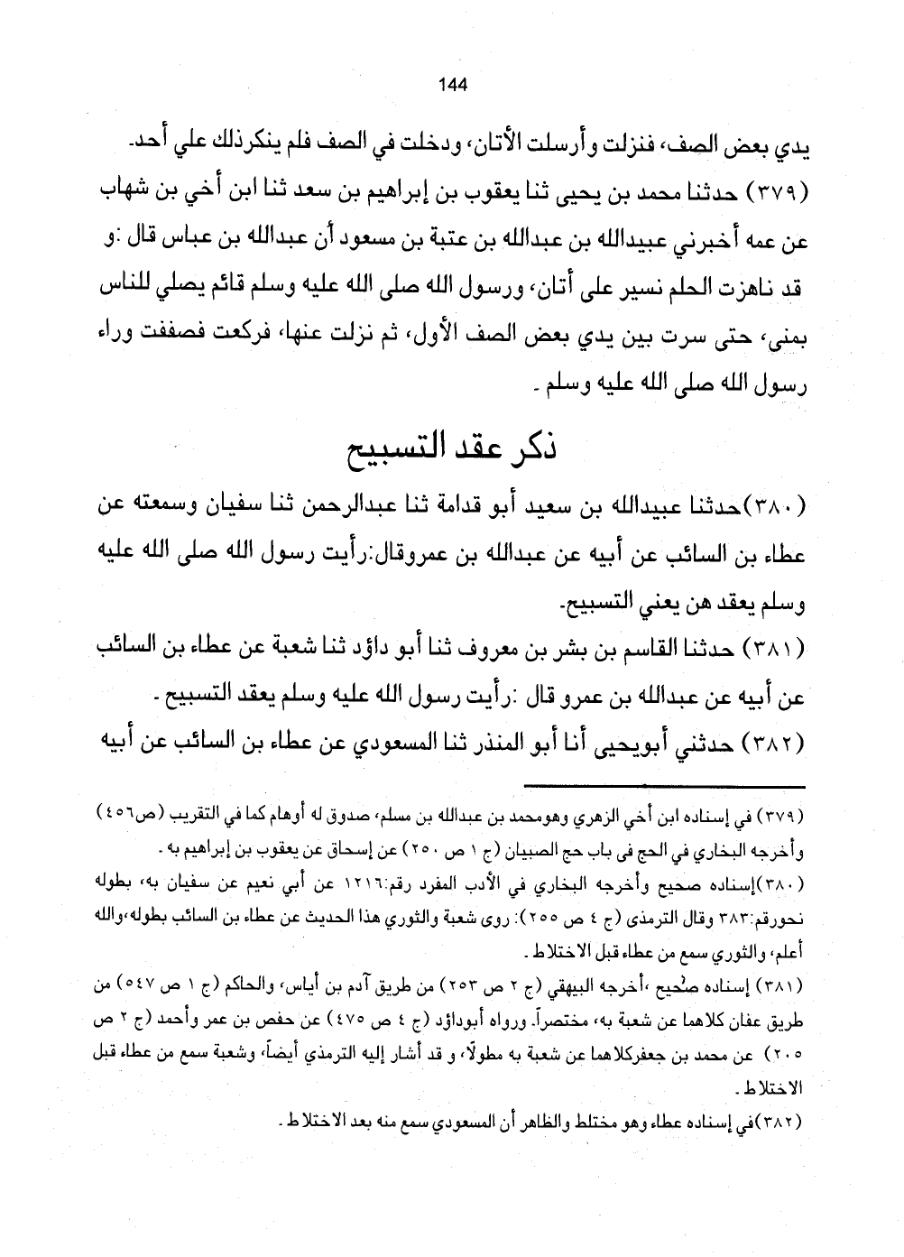 380 - حَدَّثَنَا عُبَيْدُ اللَّهِ بْنُ سَعِيدٍ أَبُو قُدَامَةَ ثَنَا عَبْدُ الرَّحْمَنِ ثَنَا سُفْيَانُ وَسَمِعْتُهُ عَنْ عَطَاءَ بْنَ السَّائِبِ عَنْ أَبِيهِ عَنْ عَبْدِ اللَّهِ بْنِ عَمْرٍو قَالَ: رَأَيْتُ رَسُول الله صَلَّى اللهُ عَلَيْهِ وَسَلَّمَ يعْقد هن يَعْنِي التَّسْبِيحَ.