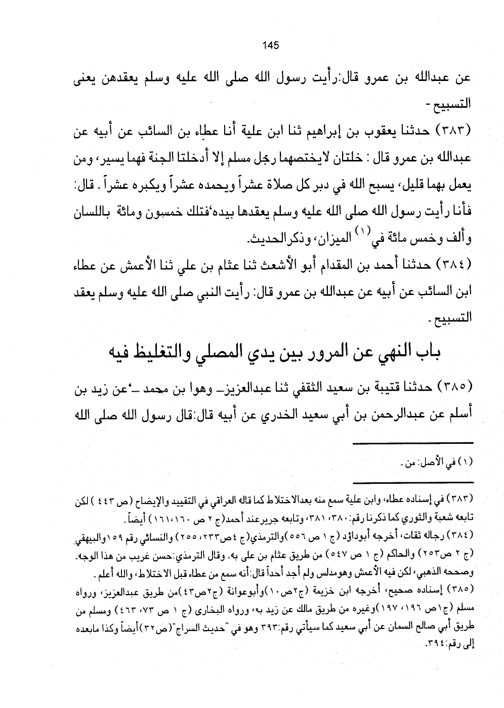 [385] إِسْنَاده صَحِيح، أخرجه ابْن خُزَيْمَة (ج2 ص10) وَأَبُو عوَانَة (ج2 ص43) من طَرِيق عبد الْعَزِيز، وَرَوَاهُ مُسلم (ج1 ص196، 197) وَغَيره من طَرِيق مَالك عَن زيد بِهِ، وَرَوَاهُ البُخَارِيّ (ج1 ص73، 463) وَمُسلم من طَرِيق أبي صَالح السمان عَن أبي سعيد كَمَا سَيَأْتِي رقم: 393 وَهُوَ فِي "حَدِيث السراج" (ص32) أَيْضا وَكَذَا مَا بعده إِلَى رقم: 394.