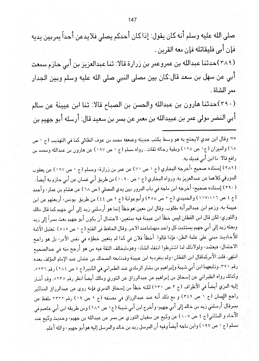 [390] إِسْنَاده صَحِيح، أخرجه ابْن مَاجَه فِي بَاب الْمُرُور بَين يَدي الْمصلى (ص68) عَن هِشَام بن عمار، وَأحمد (ج4 ص116، 117) والْحميدِي (ج2 ص358) وَأَبُو عوَانَة (ج2 ص44) من طَرِيق يُونُس، أربعتهم عَن ابْن عُيَيْنَة بِهِ. وَزعم ابْن عبد الْبر أَنه مقلوب. وَقَالَ ابْن معِين: هُوَ خطأ إِنَّمَا هُوَ أَرْسلنِي زيد إِلَى أبي جهيم كَمَا قَالَ مَالك وَالثَّوْري، لَكِن قَالَ ابْن الْقطَّان: لَيْسَ خطأ ابْن عُيَيْنَة فِيهِ بمتعين، لاحْتِمَال أَن يكون أَبُو جهيم بعث يسرا إِلَى زيد وَبَعثه زيد إِلَى أبي جهيم يستثبت كل وَاد مِنْهُمَا مَا عِنْد الآخر. وَقَالَ الْحَافِظ فِي الْفَتْح (ج1 ص585) : تَعْلِيل الْأَئِمَّة للأحاديث، فيعتمد، وَلَوْلَا ذَلِك لما اشترطوا انْتِفَاء الشاذ، وَهُوَ مَا يُخَالف الثِّقَة فِيهِ من هُوَ أرجح مِنْهُ فِي حد الصَّحِيح انْتهى. قَالَت: الْأَمر كَمَا قَالَ ابْن الْقطَّان، وَلم ينْفَرد بِهِ ابْن عُيَيْنَة وَقد تَابعه الضَّحَّاك بن عُثْمَان عِنْد الإِمَام الْمُؤلف بعده رقم: 391. وتابعهما ابْن أبي شيبَة وَإِبْرَاهِيم بن بشار الرَّمَادِي عِنْد الطَّبَرَانِيّ فِي الْكَبِير (ج5 ص284) رقم: 5236. وَكَذَلِكَ رَوَاهُ الطَّبَرَانِيّ عَن إِسْحَاق بن إِبْرَاهِيم عَن عبد الرَّزَّاق عَن الثَّوْريّ وَمَالك أَيْضا انْظُر رقم: 5235. وَقد أَشَارَ إِلَيْهِ الْمزي أَيْضا الْأَطْرَاف (ج3 ص231) لكنه خطأ من إِسْحَاق الذبري فَإِنَّهُ روى عَن عبد الرَّزَّاق الْمَنَاكِير رَاجع اللِّسَان (ج1 ص349) وَمَعَ ذَلِك أَنه عِنْد عبد الرَّزَّاق فِي مُصَنفه (ج2 ص19) رقم: 2322 بِلَفْظ: عَن بسر قَالَ: أَرْسلنِي زيد بن خَالِد إِلَى أبي جهيم، وَأخرج ابْن أبي شيبَة (ج1 ص282) وَمن طَرِيقه ابْن أبي عَاصِم فِي الْآحَاد والمثاني (ج4 ص107) عَن وَكِيع عَن سُفْيَان الثَّوْريّ عَن بسر عَن عبد الله بن جهيم، وَحَدِيث وَكِيع عِنْد مُسلم (ج1 ص197) وَابْن مَاجَه أَيْضا وَفِيه الْمُرْسل زيد بن خَالِد والمرسل إِلَيْهِ هُوَ أَبُو جهيم، وَالله أعلم.