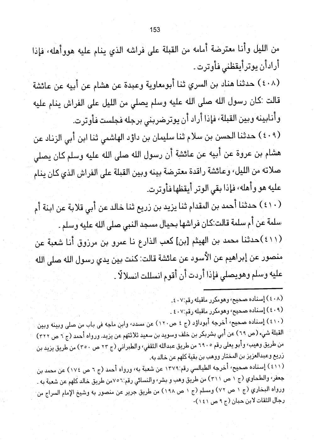 409 - حَدَّثَنَا الْحَسَنُ بْنُ سَلامٍ ثَنَا سُلَيْمَان بن داؤد الْهَاشِمِيُّ ثَنَا ابْنُ أَبِي الزِّنَادِ عَنْ هِشَام عَن عُرْوَةَ عَنْ أَبِيهِ عَنْ عَائِشَةَ أَنّ رَسُولَ اللَّهِ صَلَّى اللهُ عَلَيْهِ وَسَلَّمَ كَانَ يُصَلِّي صَلاتَهُ مِنَ اللَّيْلِ، وَعَائِشَةُ رَاقِدَةٌ مُعْتَرِضَةٌ بَيْنَهُ وَبَيْنَ الْقِبْلَةِ عَلَى الْفِرَاشِ الَّذِي كَانَ يَنَامُ عَلَيْهِ هُوَ وَأَهْلُهُ، فَإِذَا بَقِيَ الْوِتْرُ أَيْقَظَهَا فَأَوْتَرَتْ.