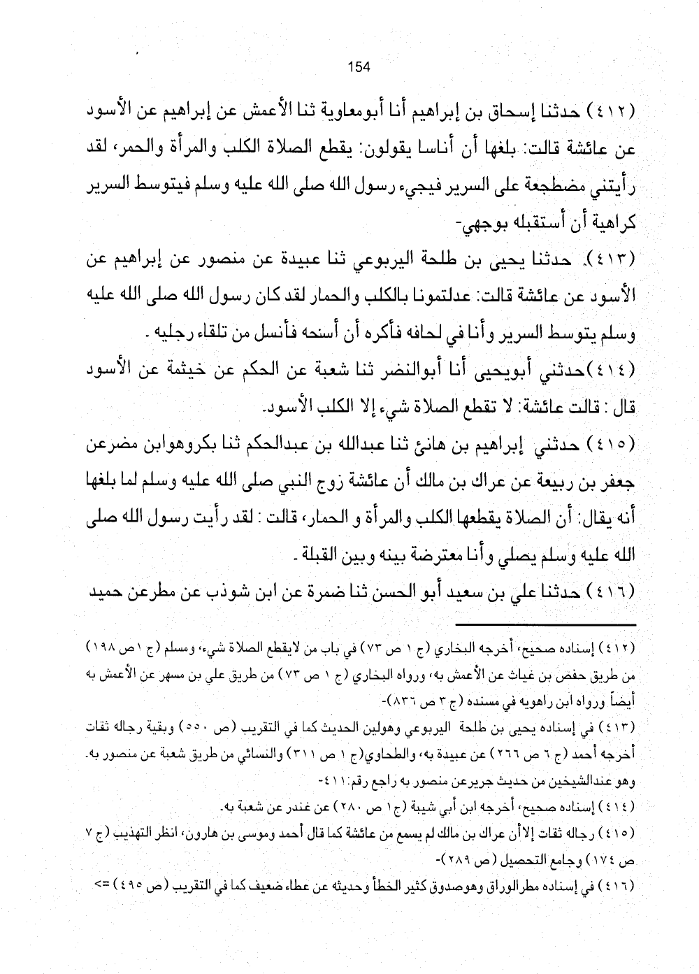 [412] إِسْنَاده صَحِيح، أخرجه البُخَارِيّ (ج1 ص73) فِي بَاب من لَا يقطع الصَّلَاة شَيْء، وَمُسلم (ج1 ص198) من طَرِيق حَفْص بن غياث عَن الْأَعْمَش بِهِ، وَرَوَاهُ البُخَارِيّ (ج1 ص73) من طَرِيق عَليّ بن مسْهر عَن الْأَعْمَش بِهِ. أَيْضا وَرَوَاهُ ابْن رَاهَوَيْه فِي مُسْنده (ج3 ص836) .