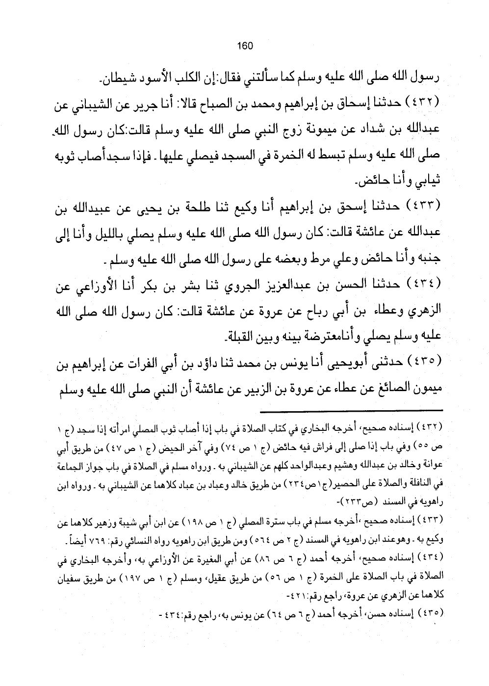 [432] إِسْنَاده صَحِيح، أخرجه البُخَارِيّ فِي كتاب الصَّلَاة فِي بَاب إِذا أصَاب ثوب الْمُصَلِّي امْرَأَته إِذا سجد (ج1 ص55) وَفِي بَاب إِذا صَلَّى اللهُ عَلَيْهِ وَسَلَّمَ إِلَى فرَاش فِيهِ حَائِض (ج1 ص74) وَفِي آخر الْحيض (ج1 ص47) من طَرِيق أبي عوَانَة وخَالِد بن عبد الله وهشيم وَعبد الْوَاحِد كلهم عَن الشَّيْبَانِيّ بِهِ. وَرَوَاهُ مُسلم فِي الصَّلَاة فِي بَاب جَوَاز الْجَمَاعَة فِي النَّافِلَة والصالة على الْحَصِير (ج1 ص234) من طَرِيق خَالِد وَعباد بن عباد كِلَاهُمَا عَن الشَّيْبَانِيّ بِهِ. وَرَوَاهُ ابْن رَاهَوَيْه فِي الْمسند (ص233) .