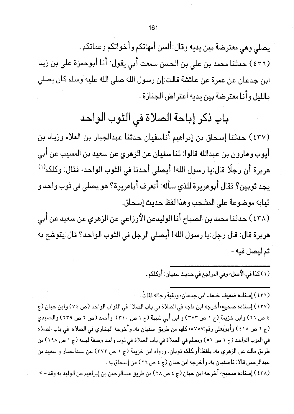 [437] إِسْنَاده صَحِيح، أخرجه ابْن مَاجَه فِي الصَّلَاة فِي بَاب "الصلا" فِي الثَّوَاب الْوَاحِد (ص74) وَابْن حبَان (ج4 ص26) وَابْن خُزَيْمَة (ج1 ص373) وَابْن أبي شيبَة (ج1 ص310) وَأحمد (ص2 ص239) والْحميدِي (ج2 ص418) وَأَبُو يعلى رقم: 5757، كلهم من طَرِيق سُفْيَان بِهِ. وَأخرجه البُخَارِيّ فِي الصَّلَاة فِي ثوب وَاحِد وَصفَة لبسه (ج1 ص198) من طَرِيق مَالك عَن الزُّهْرِيّ بِهِ. بِلَفْظ: أَو لكلكم ثَوْبَان. وَرَوَاهُ ابْن خُزَيْمَة (ج1 ص373) عَن عبد الْجَبَّار وَسَعِيد بن عبد الرَّحْمَن قَالَا: نَا سُفْيَان بِهِ. وَأخرجه ابْن حبَان (ج4 ص26) عَن إِسْحَاق بِهِ.