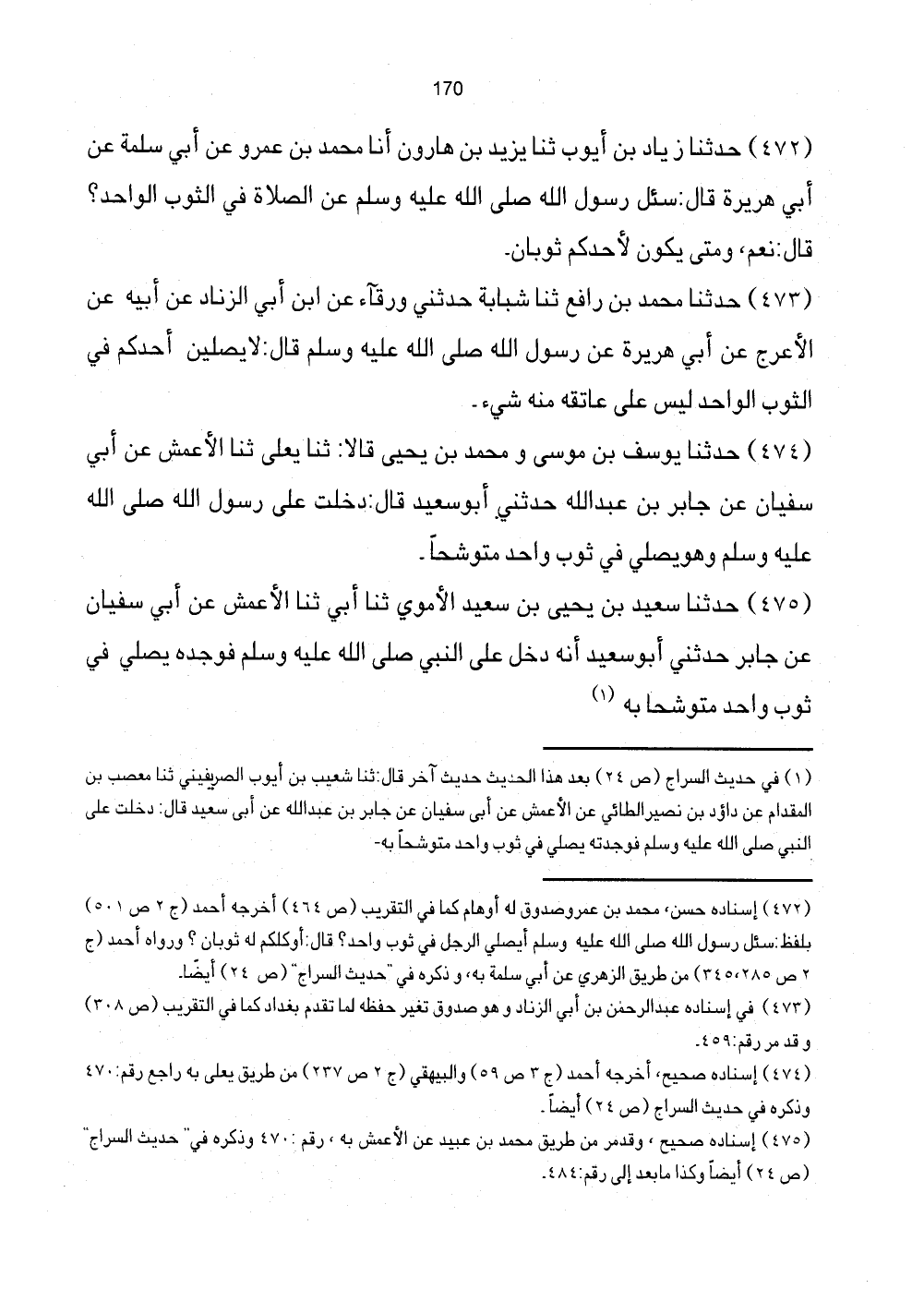 [472] إِسْنَاده حسن، مُحَمَّد بن عمر وصدوق لَهُ أَوْهَام كَمَا فِي التَّقْرِيب (ص464) أخرجه أَحْمد (ج2 ص501) بِلَفْظ: سُئِلَ رَسُول الله صَلَّى اللهُ عَلَيْهِ وَسَلَّمَ أيصلي الرجل فِي ثوب وَاحِد؟ قَالَ: أوكلكم لَهُ ثَوْبَان؟ وَرَوَاهُ أَحْمد (ج2 ص285، 345) من طَرِيق الزُّهْرِيّ عَن أبي سَلمَة بِهِ، وَذكره فِي "حَدِيث السراج" (ص24) أَيْضا.