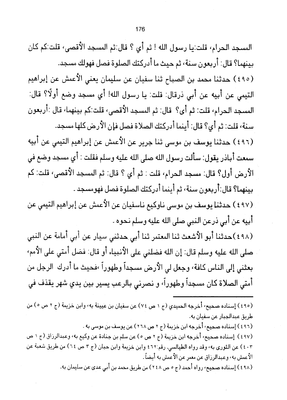 495 - حَدَّثَنَا مُحَمَّدُ بْنُ الصَّبَّاحِ ثَنَا سُفْيَانُ عَنْ سُلَيْمَانَ يَعْنِي الأَعْمَشَ عَنْ إِبْرَاهِيمَ التَّيْمِيِّ عَنْ أَبِيهِ عَنْ أَبِي ذَرٍّ قَالَ: قُلْتُ: يَا رَسُولَ اللَّهِ! أَيُّ مَسْجِدٍ وُضِعَ أَوَّلًا؟ قَالَ: الْمَسْجِد الْحَرَام، قَالَت: ثُمَّ أَيُّ؟ قَالَ: ثُمَّ الْمَسْجِدُ الأَقْصَى، قُلْتُ: كَمْ بَيْنَهُمَا، قَالَ: أَرْبَعُونَ سَنَةً، قُلْتُ: ثُمَّ أَيُّ؟ قَالَ: أَيْنَمَا أَدْرَكَتْكَ الصَّلاةُ فَصَلِّ فَإِنَّ الأَرْضَ كُلُّهَا مَسْجِدٌ.