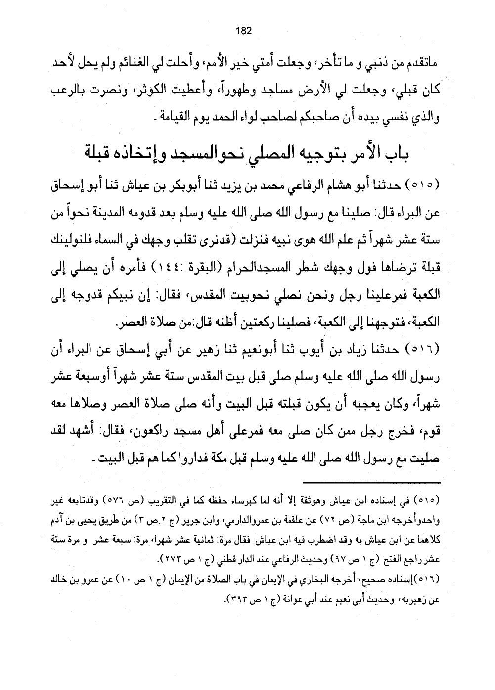 [515] فِي إِسْنَاده ابْن عَيَّاش وَهُوَ ثِقَة إِلَّا أَنه لما كبرساء حفظه كَمَا فِي التَّقْرِيب (ص576) وَقد تَابعه غير وَاحِد وَأخرجه ابْن مَاجَه (ص72) عَن عَلْقَمَة بن عمر والدرامي، وَابْن جرير (ج2 ص3) من طري يحيى بن آدم كِلَاهُمَا عَن ابْن عَيَّاش بِهِ وَقد اضْطربَ فِيهِ ابْن عَيَّاش فَقَالَ مرّة: ثَمَانِيَة عشر شهرا، مرّة: سَبْعَة عشر وَمرَّة سِتَّة عشر رَاجع الْفَتْح (ج1 ص97) وَحَدِيث الرِّفَاعِي عِنْد الدَّارقطني (ج1 ص273) .