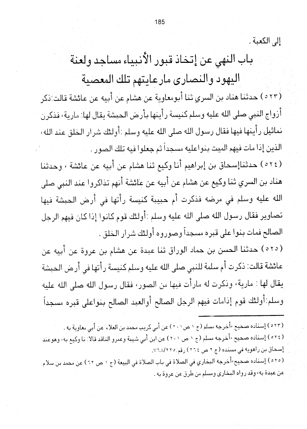 523 - حَدَّثَنَا هَنَّادُ بْنُ السَّرِيِّ ثَنَا أَبُو مُعَاوِيَةَ عَنْ هِشَامٍ عَنْ أَبِيهِ عَنْ عَائِشَةَ قَالَتْ: ذَكَرَ أَزْوَاجُ النَّبِيِّ صَلَّى اللهُ عَلَيْهِ وَسَلَّمَ كَنِيسَةً رَأَيْنَهَا بِأَرْضِ الْحَبَشَةِ يُقَالُ لَهَا: مَارِيَةُ، فَذَكَرْنَ تَمَاثِيلَ رَأَيْنَهَا فِيهَا فَقَالَ رَسُولُ اللَّهِ صَلَّى اللهُ عَلَيْهِ وَسَلَّمَ: أُولَئِكَ شِرَارُ الْخَلْقِ عِنْدَ اللَّهِ، الَّذِينَ إِذَا مَاتَ فِيهِمُ الْمَيِّتُ بَنُوا عَلَيْهِ مَسْجِدًا ثُمَّ جَعَلُوا فِيهِ تِلْكَ الصُّوَرَ.