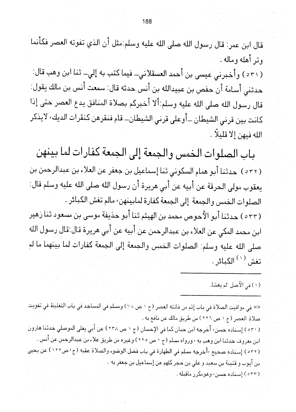 533 - حَدَّثَنَا أَبُو الأَحْوَصِ مُحَمَّدُ بْنُ الْهَيْثَمِ ثَنَا أَبُو حُذَيْفَةَ مُوسَى بْنُ مَسْعُودٍ ثَنَا زُهَيْرُ ابْنُ مُحَمَّدٍ الْمَكِّيُّ عَنِ الْعَلاءِ بْنِ عَبْدِ الرَّحْمَنِ عَنْ أَبِيهِ عَنْ أَبِي هُرَيْرَةَ قَالَ: قَالَ رَسُولُ اللَّهِ صَلَّى اللهُ عَلَيْهِ وَسَلَّمَ: الصَّلَوَاتُ الْخَمْسُ وَالْجُمُعَةُ إِلَى الْجُمُعَةِ كَفَّارَاتٌ لِمَا بَيْنَهُمَا مَا لَمْ تُغْشَ (1) الْكَبَائِرُ.