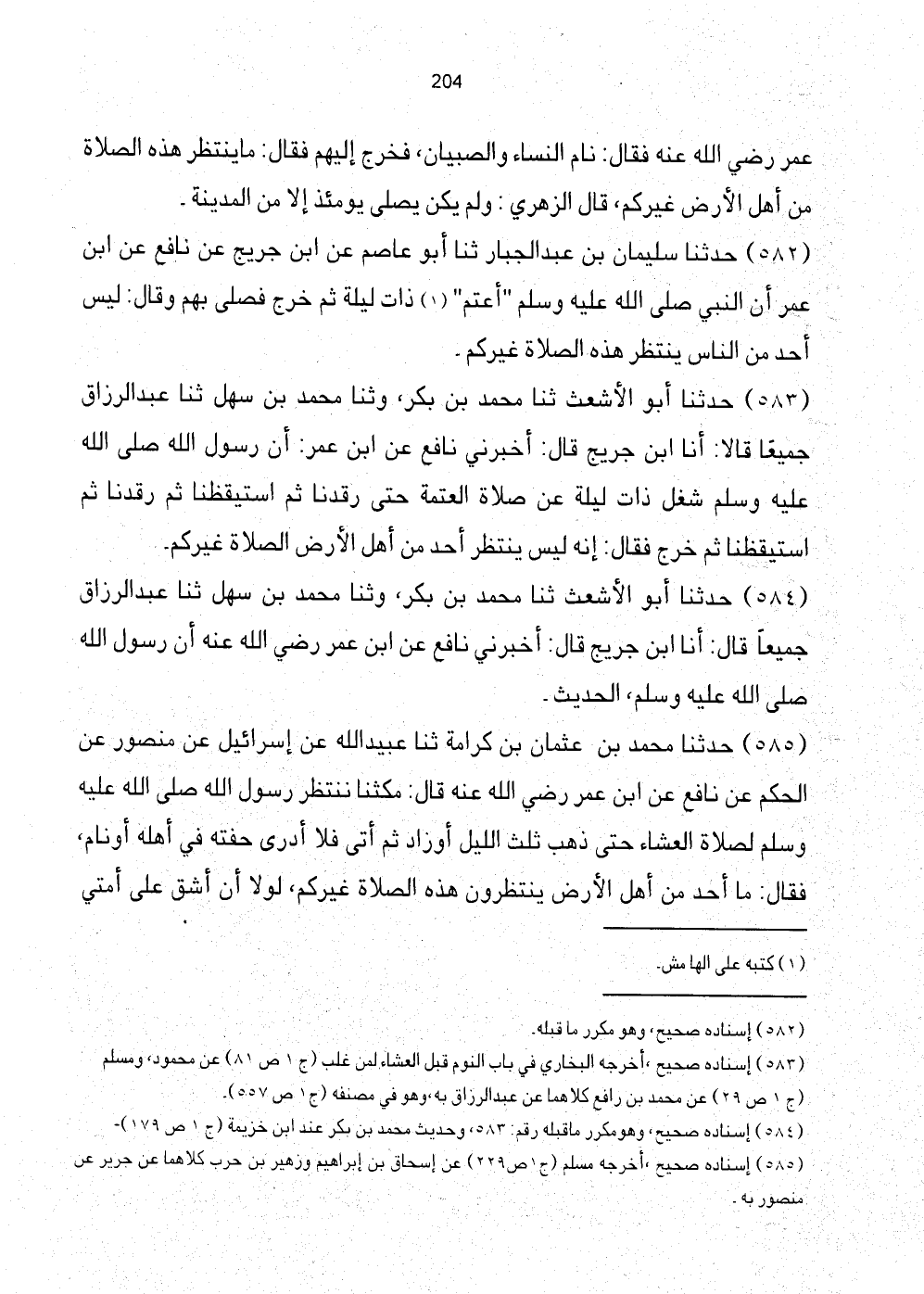 582 - حَدَّثَنَا سُلَيْمَانُ بْنُ عَبْدِ الْجَبَّارِ ثَنَا أَبُو عَاصِمٍ عَنِ ابْن جُرَيْجٍ عَنْ نَافِعٍ عَنِ ابْنِ عُمَرَ أَنّ النَّبِيَّ صَلَّى اللهُ عَلَيْهِ وَسَلَّمَ "أَعْتَمَ" (1) ذَاتَ لَيْلَةٍ ثُمَّ خَرَجَ فَصَلَّى بِهِمْ وَقَالَ: لَيْسَ أَحَدٌ مِنَ النَّاسِ يَنْتَظِرُ هَذِهِ الصَّلاةُ غَيْرُكُمْ.
