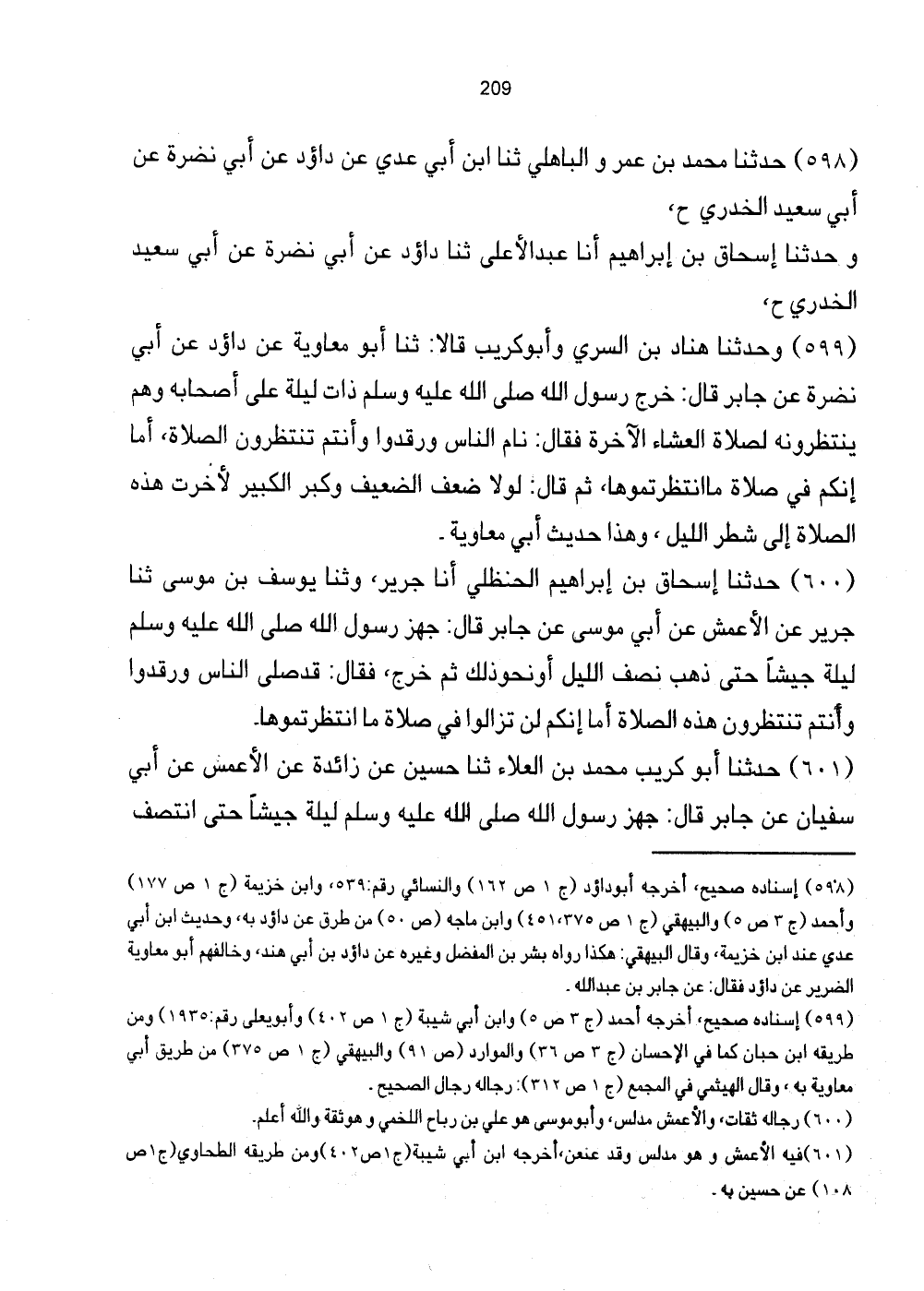 [599] إِسْنَاده صَحِيح، أخرجه أَحْمد (ج3 ص5) وَابْن أبي شيبَة (ج1 ص402) وَأَبُو يعلى رقم: 1935) وَمن طَرِيقه ابْن حبَان كَمَا فِي الْإِحْسَان (ج3 ص36) والموارد (ص91) وَالْبَيْهَقِيّ (ج1 ص375) من طَرِيق أبي مُعَاوِيَة بِهِ، وَقَالَ الهيثمي فِي الْمجمع (ج1 ص312) : رِجَاله رجال الصَّحِيح.