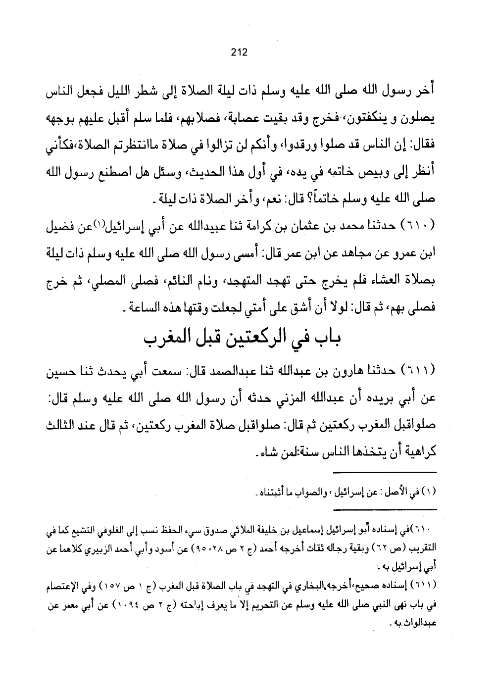 [611] إِسْنَاده صَحِيح، أخرجه البُخَارِيّ فِي التَّهَجُّد فِي بَاب الصَّلَاة قبل الْمغرب (ج1 ص157) وَفِي الِاعْتِصَام فِي بَاب نهي النَّبِي صَلَّى اللهُ عَلَيْهِ وَسَلَّمَ التَّحْرِيم مَا يعرف إِبَاحَته (ج2 ص1094) عَن أبي معمر عَن عبد الْوَارِث بِهِ.
