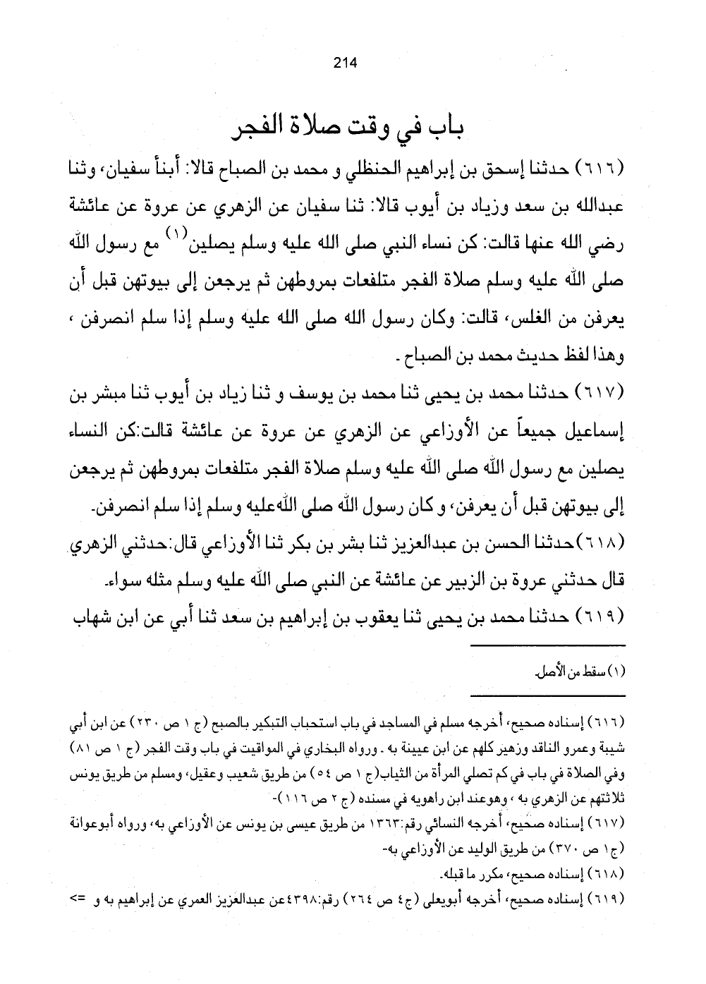 [616] إِسْنَاده صَحِيح، أخرجه مُسلم فِي الْمَسَاجِد فِي بَاب اسْتِحْبَاب التبكير بالصبح (ج1 ص230) عَن ابْن أبي شيبَة وَعَمْرو النَّاقِد وَزُهَيْر كلهم عَن ابْن عُيَيْنَة بِهِ. وَرَوَاهُ البُخَارِيّ فِي الْمَوَاقِيت فِي بَاب وَقت الْفجْر (ج1 ص81) وَفِي الصَّلَاة فِي بَاب فِي كم تصلي الْمَرْأَة من الثِّيَاب (ج1 ص54) من طَرِيق شُعَيْب وَعقيل، وَمُسلم من طَرِيق يُونُس ثَلَاثَتهمْ عَن الزُّهْرِيّ بِهِ، وَهُوَ عِنْد ابْن رَاهَوَيْه فِي مُسْند (ج2 ص116) .