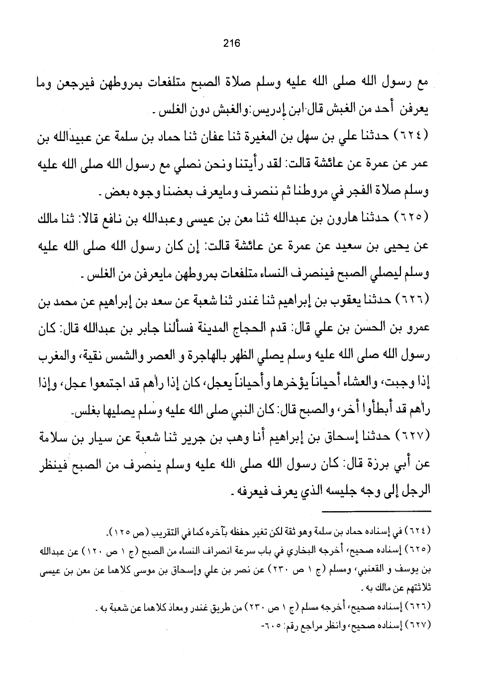 [625] إِسْنَاده صَحِيح، أخرجه البُخَارِيّ فِي بَاب سرعَة انصراف النِّسَاء من الصُّبْح (ج1 ص120) عَن عبد الله بن يُوسُف والقعنبي، وَمُسلم (ج1 ص230) عَن نصر بن عَليّ وَإِسْحَاق بن مُوسَى كِلَاهُمَا عَن معن بن عِيسَى ثَلَاثَتهمْ عَن مَالك بِهِ.