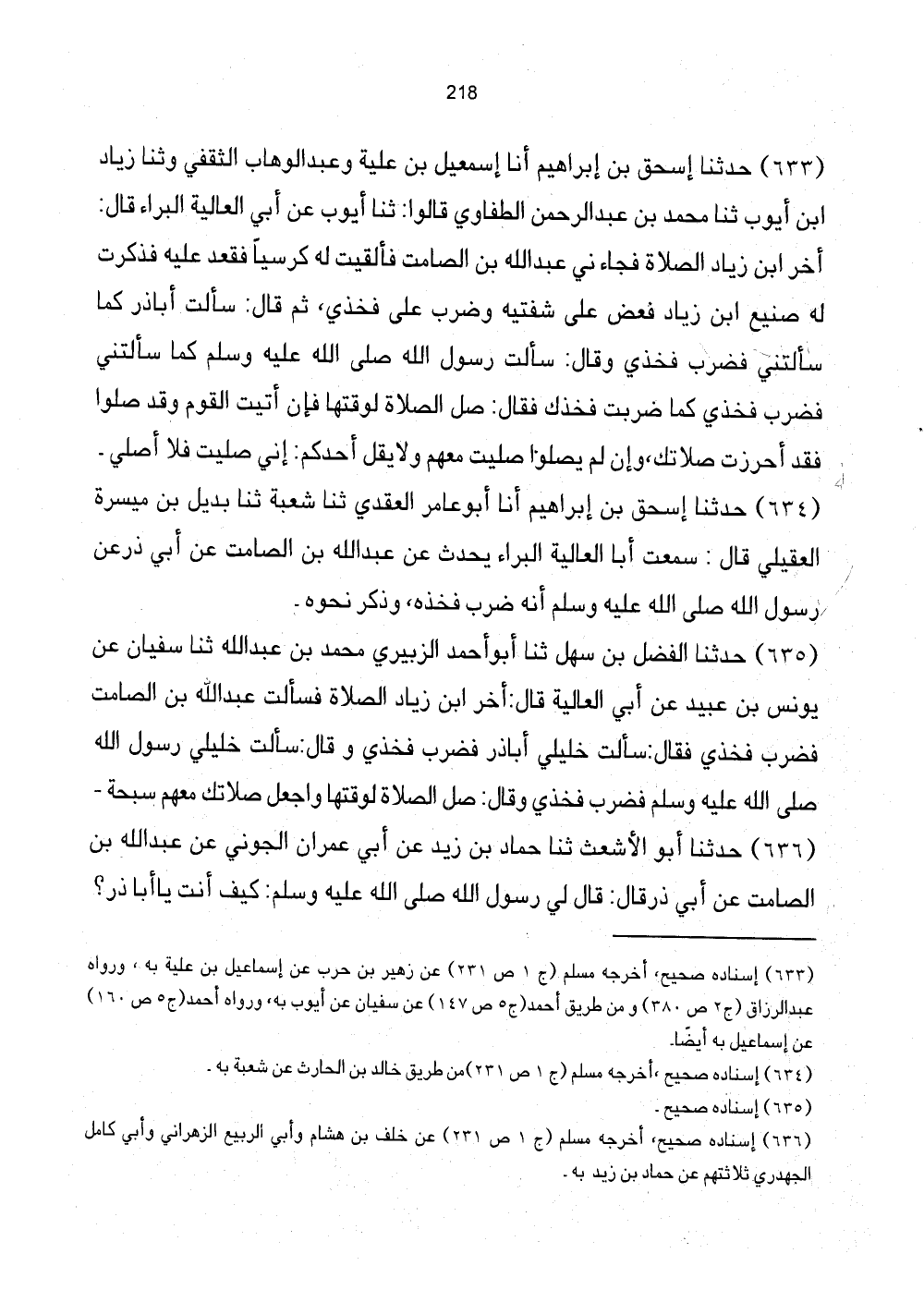 633 - حَدَّثَنَا إِسْحَاقُ بْنُ إِبْرَاهِيمَ أَنَا إِسْمَاعِيلُ بْنُ عُلَيَّةَ وَعَبْدُ الْوَهَّابِ الثَّقَفِيُّ وَثَنَا زِيَادُ ابْن أَيُّوبَ ثَنَا مُحَمَّدُ بْنُ عَبْدِ الرَّحْمَنِ الطَّفَاوِيُّ قَالُوا: ثَنَا أَيُّوبُ عَنْ أَبِي الْعَالِيَةِ الْبَرَاءُ قَالَ: أَخَّرَ ابْنُ زِيَادٍ الصَّلاةَ فَجَاءَنِي عَبْدُ اللَّهِ بْنُ الصَّامِتِ فَأَلْقَيْتُ لَهُ كُرْسِيًا فَقَعَدَ عَلَيْهِ فَذَكَرْتُ لَهُ صَنِيعَ ابْنِ زِيَادٍ فَعَضَّ عَلَى شَفَتَيْهِ وَضَرَبَ عَلَى فَخْذِي، ثُمَّ قَالَ: سَأَلْتُ أَبَا ذَرٍّ كَمَا سَأَلْتَنِي فَضَرَبَ فَخْذِي وَقَالَ: سَأَلْتُ رَسُولَ اللَّهِ صَلَّى اللهُ عَلَيْهِ وَسَلَّمَ كَمَا سَأَلْتَنِي فَضَرَبَ فَخْذِي كَمَا ضَرْبُتَ فَخْذَكَ فَقَالَ: صَلَّى اللهُ عَلَيْهِ وَسَلَّمَ الصَّلاةُ لِوَقْتِهَا فَإِنْ أَتَيْتَ الْقَوْمَ وَقَدْ صَلُّوا فَقَدْ أَحْرَزْتَ صَلاتَكَ، وَإِنْ لَمْ يُصَلُّوا صَلَّيْتَ مَعَهم وَلَا يقبل أَحَدُكُمْ: إِنِّي صَلَّيْتُ فَلا أُصَلِّي.