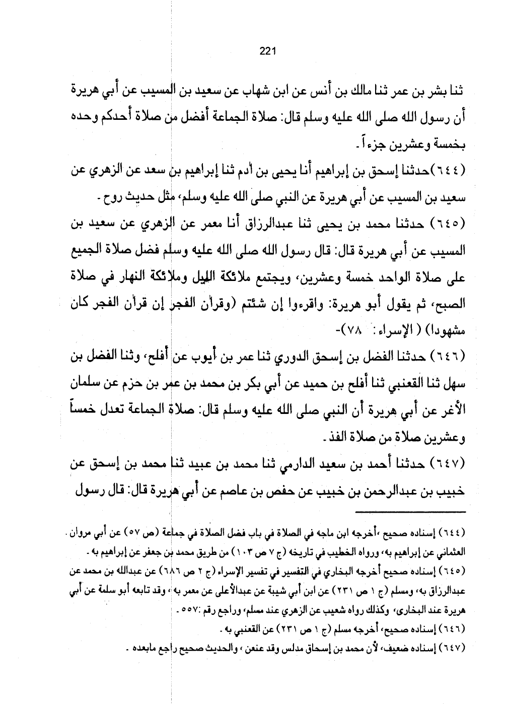 ثَنَا بِشْرُ بْنُ عُمَرَ ثَنَا مَالِكُ بْنُ أَنَسٍ عَنِ ابْنِ شِهَابٍ عَنْ سَعِيدِ بْنِ الْمُسَيِّبِ عَنْ أَبِي هُرَيْرَةَ أَنّ رَسُولَ اللَّهِ صَلَّى اللهُ عَلَيْهِ وَسَلَّمَ قَالَ: صَلاةُ الْجَمَاعَةِ أَفْضَلُ مِنْ صَلاةِ أَحَدِكُمْ وَحْدَهُ بِخَمْسَةٍ وَعِشْرِينَ جُزْءًا.