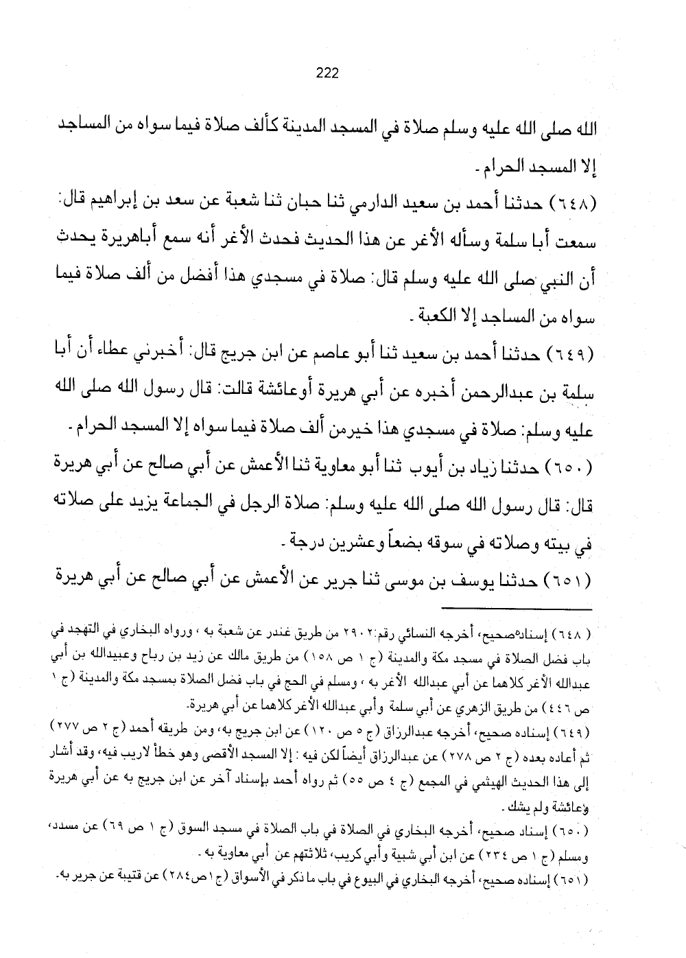 [649] إِسْنَاده صَحِيح، أخرجه عبد الرَّزَّاق (ج5 ص120) عَن ابْن جريج بِهِ، وَمن طَرِيقه أَحْمد (ج2 ص227) ثمَّ أَعَادَهُ بعده (ج2 ص278) عَن عبد الرَّزَّاق أَيْضا لكنه فِيهِ: إِلَّا الْمَسْجِد الْأَقْصَى وَهُوَ خطأ لَا ريب فِيهِ، وَقد أَشَارَ إِلَى هَذَا الحَدِيث الهيثمي فِي الْمجمع (ج4 ص55) ثمَّ رَوَاهُ بِإِسْنَاد آخر عَن ابْن جريج بِهِ عَن أبي هُرَيْرَة وَعَائِشَة وَلم يُشَارك.