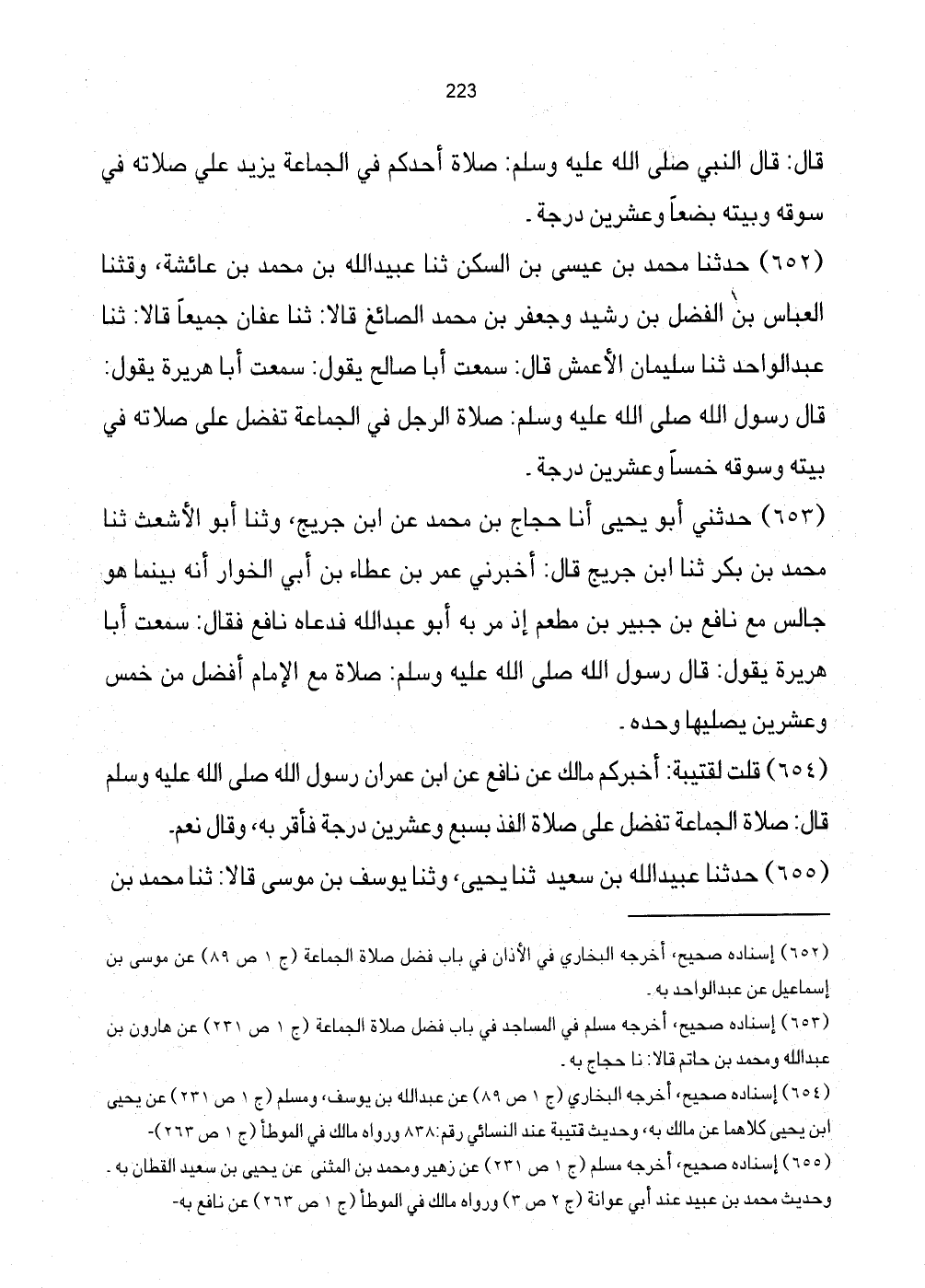 [653] إِسْنَاده صَحِيح، أخرجه مُسلم فِي الْمَسَاجِد فِي بَاب فضل صَلَاة الْجَمَاعَة (ج1 ص231) عَن هَارُون بن عبد الله وَمُحَمّد بن حَاتِم قَالَا: نَا حجاج بِهِ.