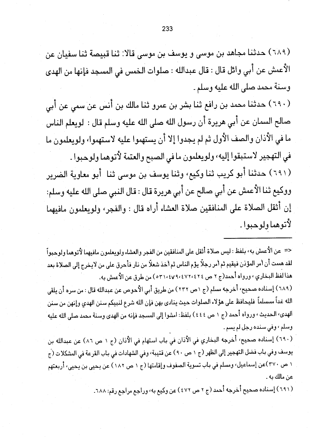 [689] إِسْنَاده صَحِيح، أخرجه مُسلم (ج1 ص232) من طَرِيق أبي الْأَحْوَص عَن عبد الله قَالَ: من سره أَن يلقى الله غَدا مُسلما فليحافظ على هَؤُلَاءِ الصَّلَوَات حَيْثُ يُنَادي بِهن فَإِن الله شرع لنبيكم سنَن الْهَدْي وإنهن من سنَن الْهدى، الحَدِيث، رَوَاهُ أَحْمد (ج1 ص444) بِلَفْظ: امشوا إِلَى الْمَسْجِد فَإِنَّهُ من الْهَدْي وَسنة مُحَمَّد صَلَّى اللهُ عَلَيْهِ وَسَلَّمَ، وَفِي سَنَده رجل لم يسم.
