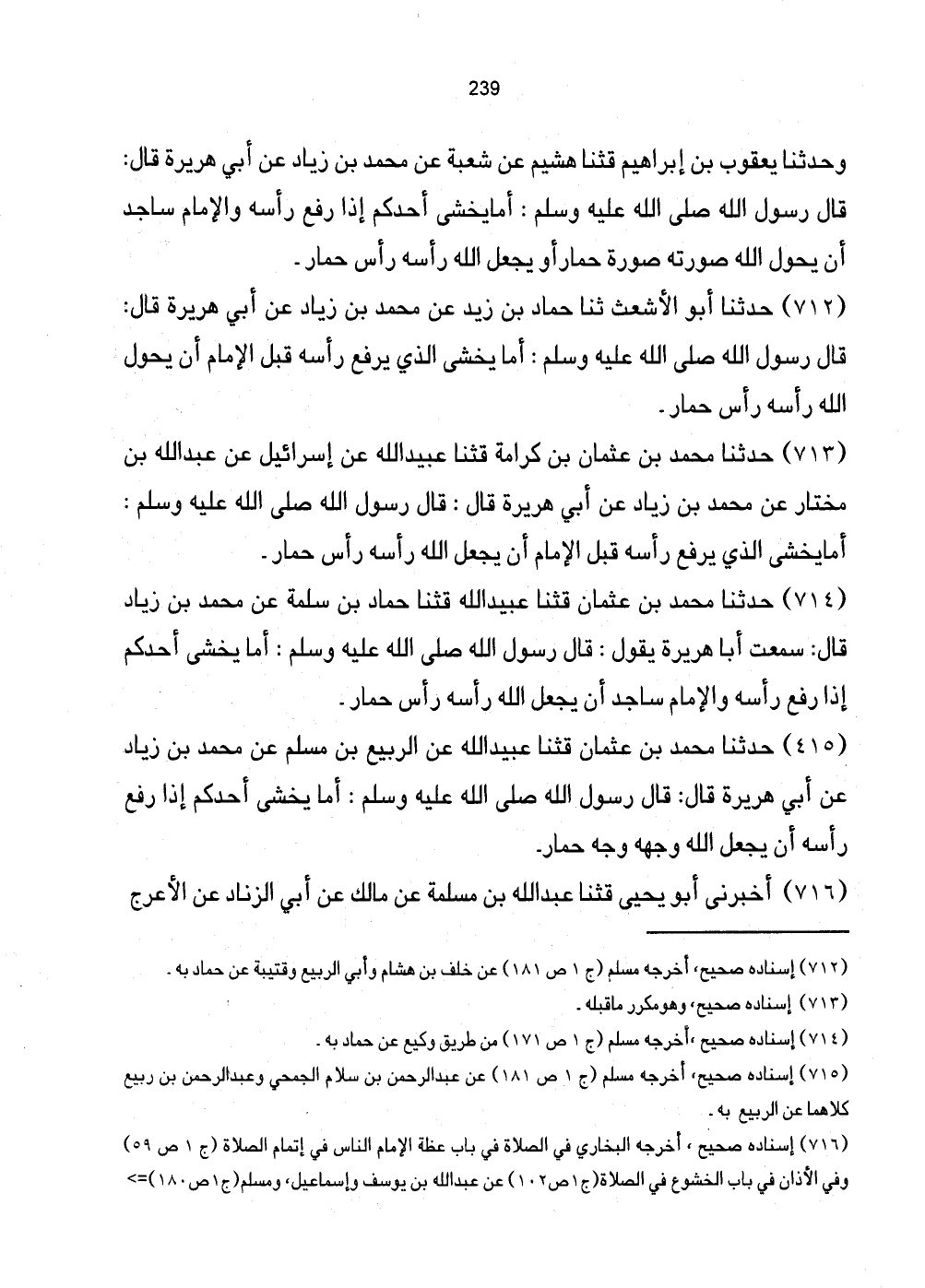 712 - حَدَّثَنَا أَبُو الْأَشْعَث ثَنَا ماد بْنُ زَيْدٍ عَنْ مُحَمَّدِ بْنِ زِيَادٍ عَنْ أَبِي هُرَيْرَةَ قَالَ: قَالَ رَسُولُ اللَّهِ صَلَّى اللهُ عَلَيْهِ وَسَلَّمَ: أَمَا يَخْشَى الَّذِي يَرْفَعُ رَأْسَهُ قَبْلَ الإِمَامِ أَنْ يُحَوِّلَ الله رَأسه حمَار.