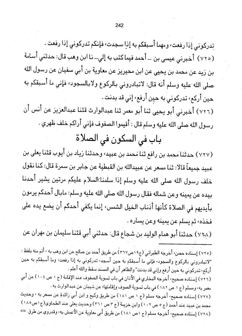[726] إِسْنَاده صَحِيح، أخرجه البُخَارِيّ فِي الْأَذَان فِي بَاب تَسْوِيَة الصُّفُوف عِنْد الْإِقَامَة (ج1 ص104) عَن أبي معمر بِهِ، وَمُسلم (ج1 ص182) فِي بَاب تَسْوِيَة الصُّفُوف وإقامتها، عَن شَيبَان عَن عبد الْوَارِث بِهِ.