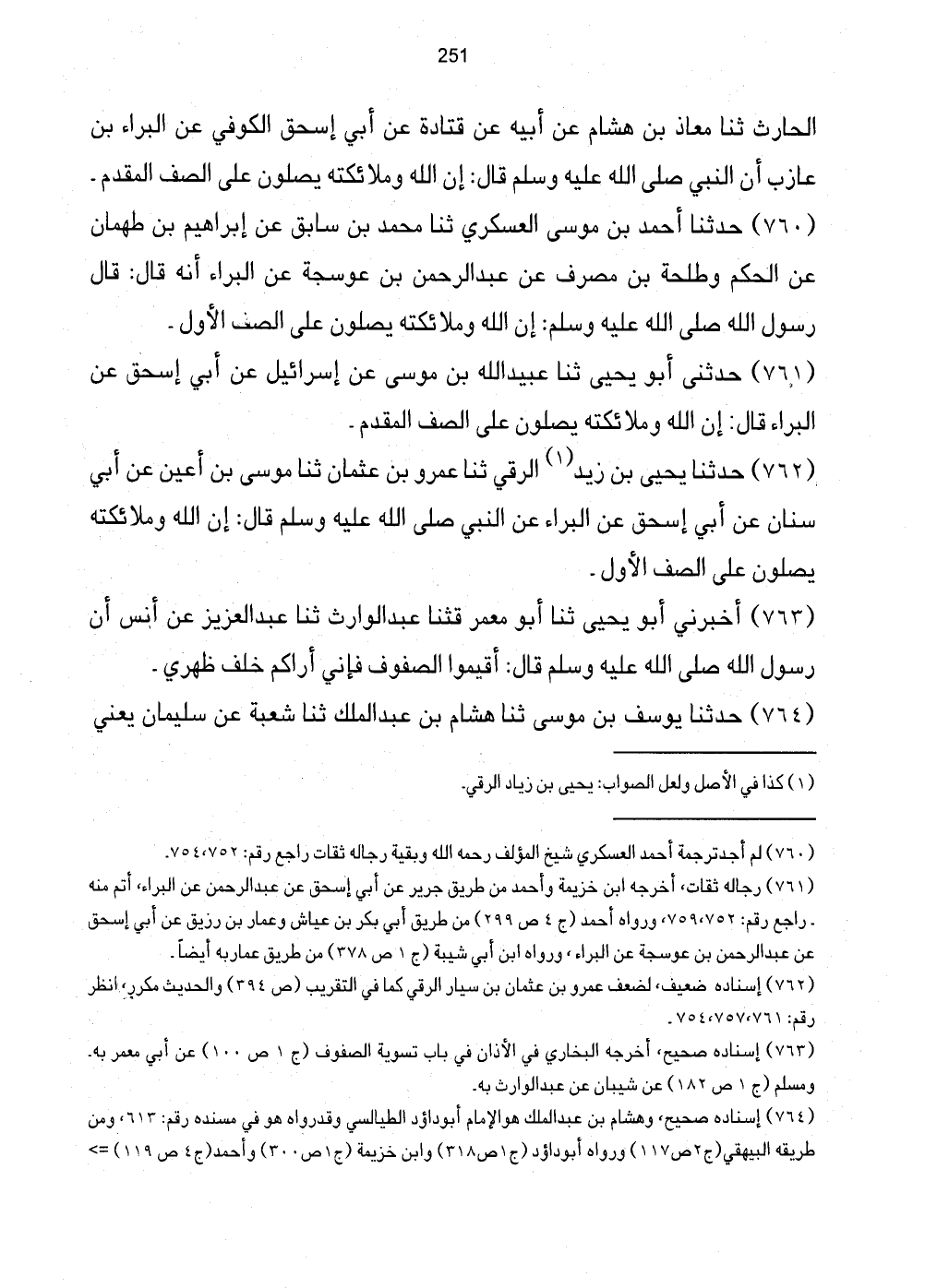 761 - حَدَّثَنِي أَبُو يَحْيَى ثَنَا عُبَيْدُ اللَّهِ بْنُ مُوسَى عَنْ إِسْرَائِيلَ عَنْ أَبِي إِسْحَاقَ عَنِ الْبَرَاءِ قَالَ: إِنَّ اللَّهَ وَمَلائِكَتَهُ يُصَلُّونَ عَلَى الصَّفِّ الْمُقَدَّمِ.