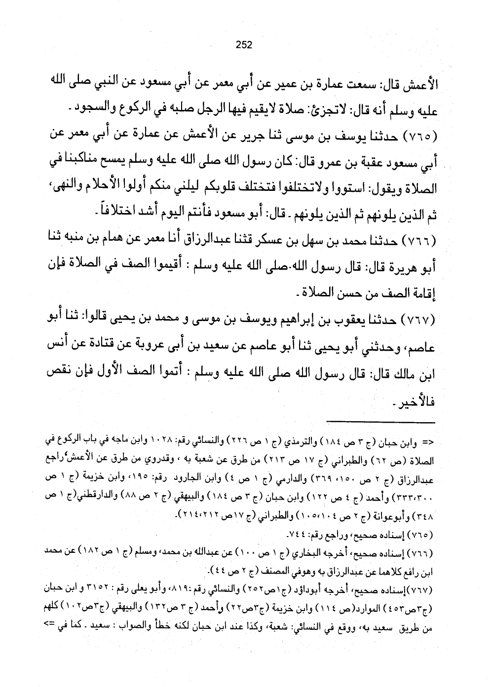 = وَابْن حبَان (ج3 ص184) وَالتِّرْمِذِيّ (ج1 ص226) وَالنَّسَائِيّ رقم: 1028 وَابْن مَاجَه فِي بَاب الرُّكُوع فِي الصَّلَاة (ص62) وَالطَّبَرَانِيّ (ج17 ص213) من طرق عَن شُعْبَة بِهِ، وَقد روى من طرق عَن الْأَعْمَش، رَاجع عبد الرَّزَّاق (ج2 ص150، 369) والدرامي (ج1 ص4) وَابْن الْجَارُود رقم: 195، وَابْن خُزَيْمَة (ج1 ص300، 333) وَأحمد (ج4 ص122) وَابْن حبَان (ج3 ص184) وَالْبَيْهَقِيّ (ج2 ص88) وَالدَّارقطني (ج1 ص348) وَأَبُو عوَانَة (ج2 ص104، 105) وَالطَّبَرَانِيّ (ج17 ص212، 214) .