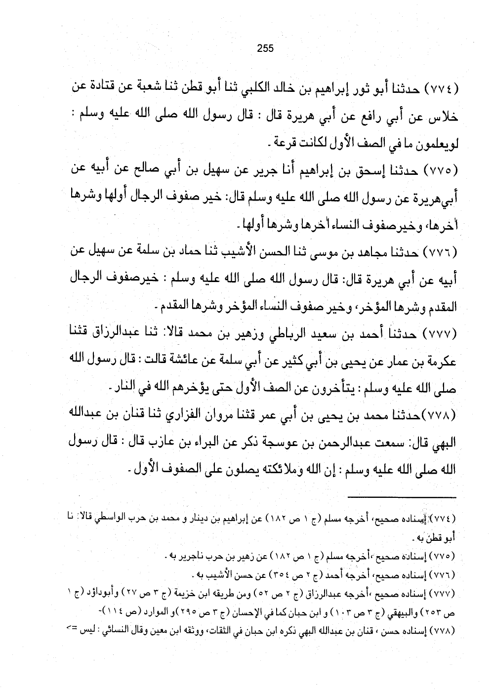 775 - حَدَّثَنَا إِسْحَاقُ بْنُ إِبْرَاهِيمَ أَنَا جَرِيرٌ عَنْ سُهَيْلِ بْنِ أَبِي صَالِحٍ عَنْ أَبِيهِ عَنْ أَبِي هُرَيْرَةَ عَنْ رَسُولِ اللَّهِ صَلَّى اللهُ عَلَيْهِ وَسَلَّمَ قَالَ: خَيْرُ صُفُوفِ الرِّجَالِ أَوَّلُهَا وَشَرُّهَا آخِرُهَا، وَخَيْرُ صُفُوفِ النِّسَاءِ آخِرُهَا وَشَرُّهَا أَوَّلُهَا.