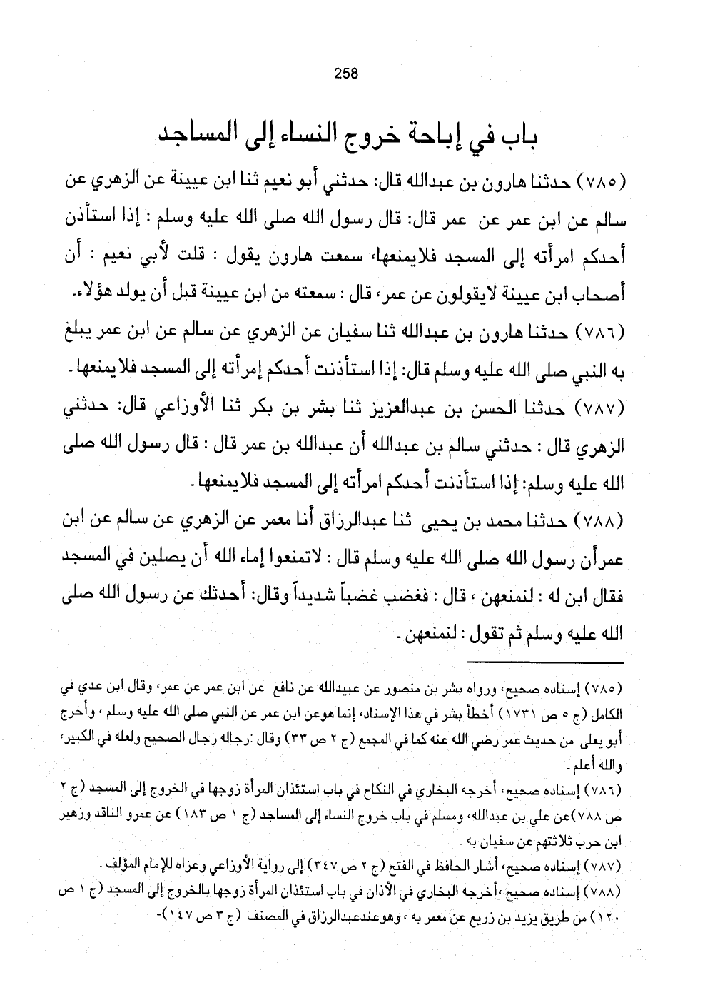 [786] إِسْنَاده صَحِيح، أخرجه البُخَارِيّ فِي النِّكَاح فِي بَاب اسْتِئْذَان الْمَرْأَة زَوجهَا فِي الْخُرُوج إِلَى الْمَسْجِد (ج2 ص788) عَن عَليّ بن عبد الله، وَمُسلم فِي بَاب خُرُوج النِّسَاء إِلَى الْمَسَاجِد (ج1 ص183) عَن عَمْرو النَّاقِد وَزُهَيْر ابْن حَرْب ثَلَاثَتهمْ عَن سُفْيَان بِهِ.