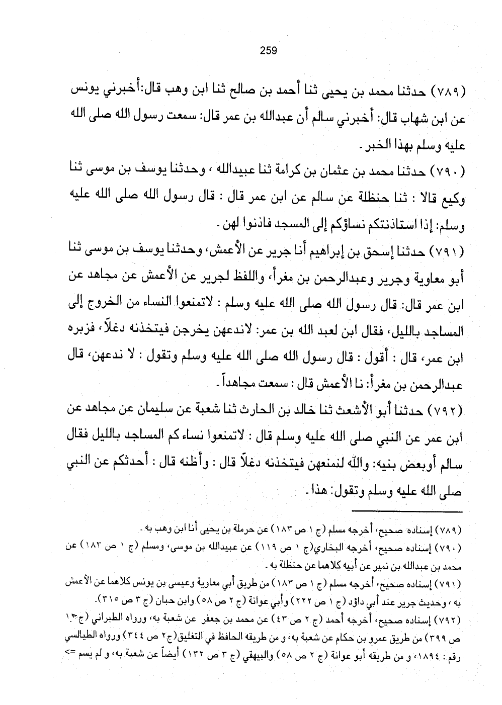 791 - حَدَّثَنَا إِسْحَاقُ بْنُ إِبْرَاهِيمَ أَنَا جَرِيرٌ عَنِ الأَعْمَشِ، وَحَدَّثَنَا يُوسُفُ بْنُ مُوسَى ثَنَا أَبُو مُعَاوِيَةَ وَجَرِيرٌ وَعَبْدُ الرَّحْمَن بن مغرأ، وَاللَّفْظُ لِجَرِيرٍ عَنِ الأَعْمَشِ عَنْ مُجَاهِدٍ عَنِ ابْنِ عُمَرَ قَالَ: قَالَ رَسُولُ اللَّهِ صَلَّى اللهُ عَلَيْهِ وَسَلَّمَ: لَا تَمْنَعُوا النِّسَاءَ مِنَ الْخُرُوجِ إِلَى الْمَسَاجِدِ بِاللَّيْلِ، فَقَالَ ابْنٌ لِعَبْدِ اللَّهِ بْنِ عُمَرَ: لَا نَدَعُهُنَّ يَخْرُجْنَ فَيَتَّخِذْنَهُ دَغَلًا، فَزَبَرَهُ ابْنُ عُمَرَ، قَالَ: أَقُولُ: قَالَ رَسُولُ اللَّهِ صَلَّى اللهُ عَلَيْهِ وَسَلَّمَ وَتَقُولُ: لَا نَدَعُهُنَّ، قَالَ عَبْدُ الرَّحْمَن بن مغرأ: نَا الأَعْمَشُ قَالَ: سَمِعْتُ مُجَاهِدًا.