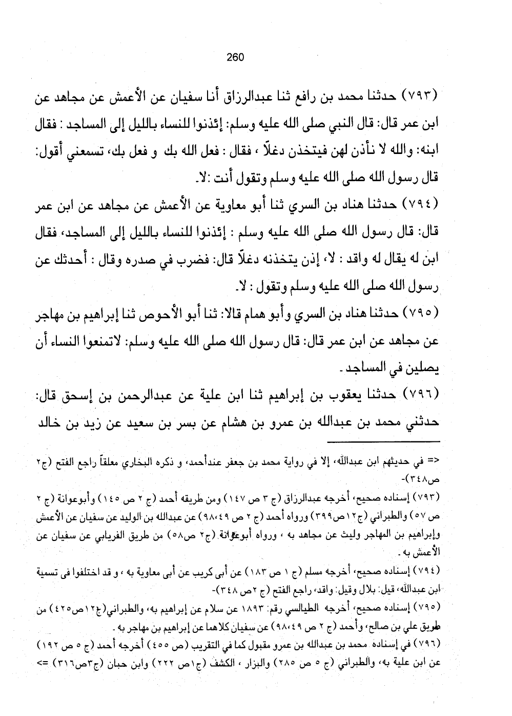 [793] إِسْنَاده صَحِيح، أخرجه عبد الرَّزَّاق (ج3 ص147) وَمن طَرِيق أَحْمد (ج2 ص145) وَأَبُو عوَانَة (ج2 ص57) وَالطَّبَرَانِيّ (ج12 ص399) وَرَوَاهُ أَحْمد (ج2 ص49، 98) عَن عبد الله بن الْوَلِيد عَن سُفْيَان عَن الْأَعْمَش وَإِبْرَاهِيم بن المُهَاجر وَلَيْث عَن مُجَاهِد بِهِ، وَرَوَاهُ أبوعوانة (ج2 ص58) من طَرِيق الْفرْيَابِيّ عَن سُفْيَان عَن الْأَعْمَش بِهِ.