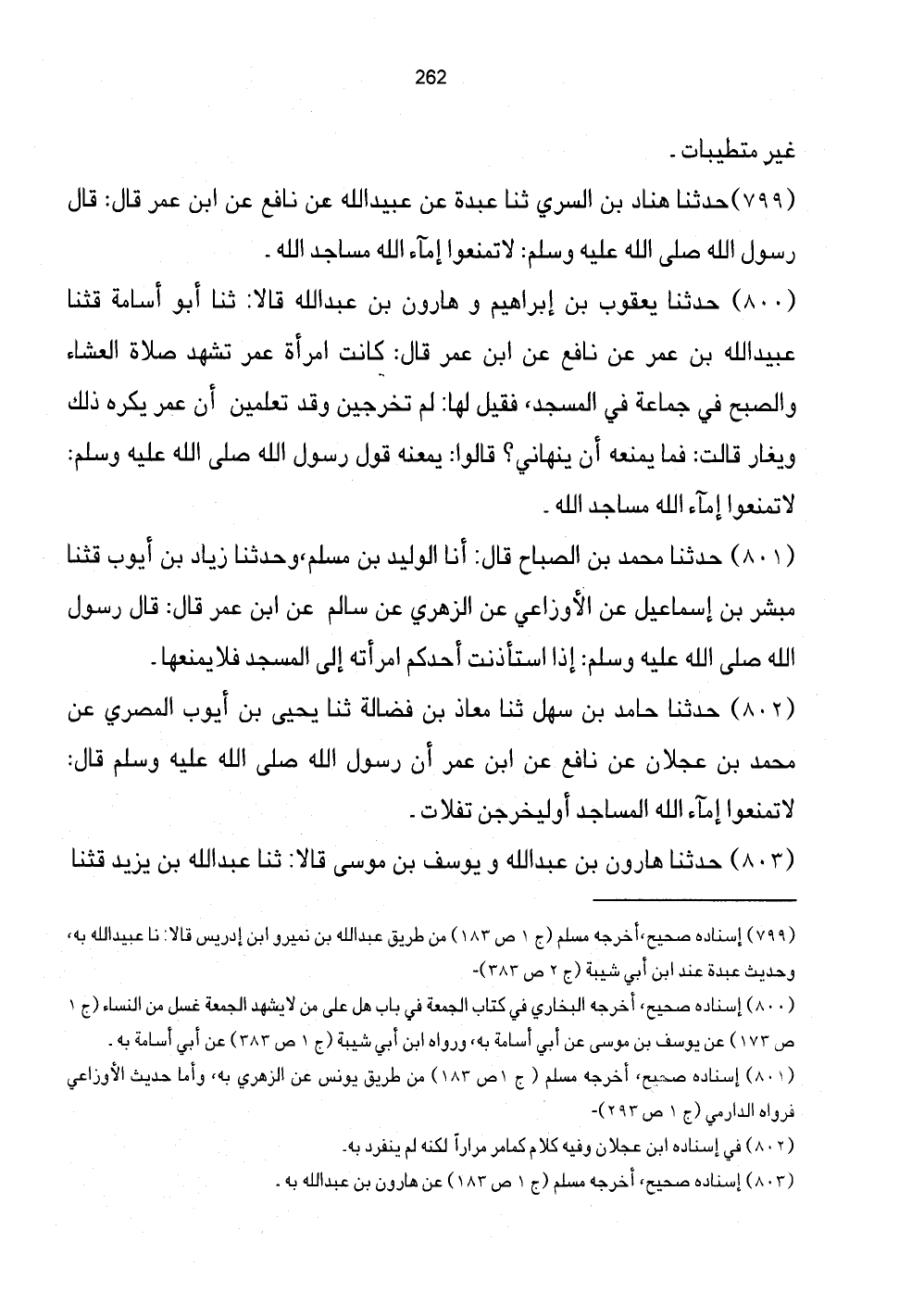 799 - حَدَّثَنَا هَنَّادُ بن السرى ثناعبدة عَنْ عُبَيْدِ اللَّهِ عَنْ نَافِعٍ عَنِ ابْنِ عُمَرَ قَالَ: قَالَ رَسُولُ اللَّهِ صَلَّى اللهُ عَلَيْهِ وَسَلَّمَ: لَا تَمْنَعُوا إِمَاءَ اللَّهِ مَسَاجِدَ اللَّهِ.