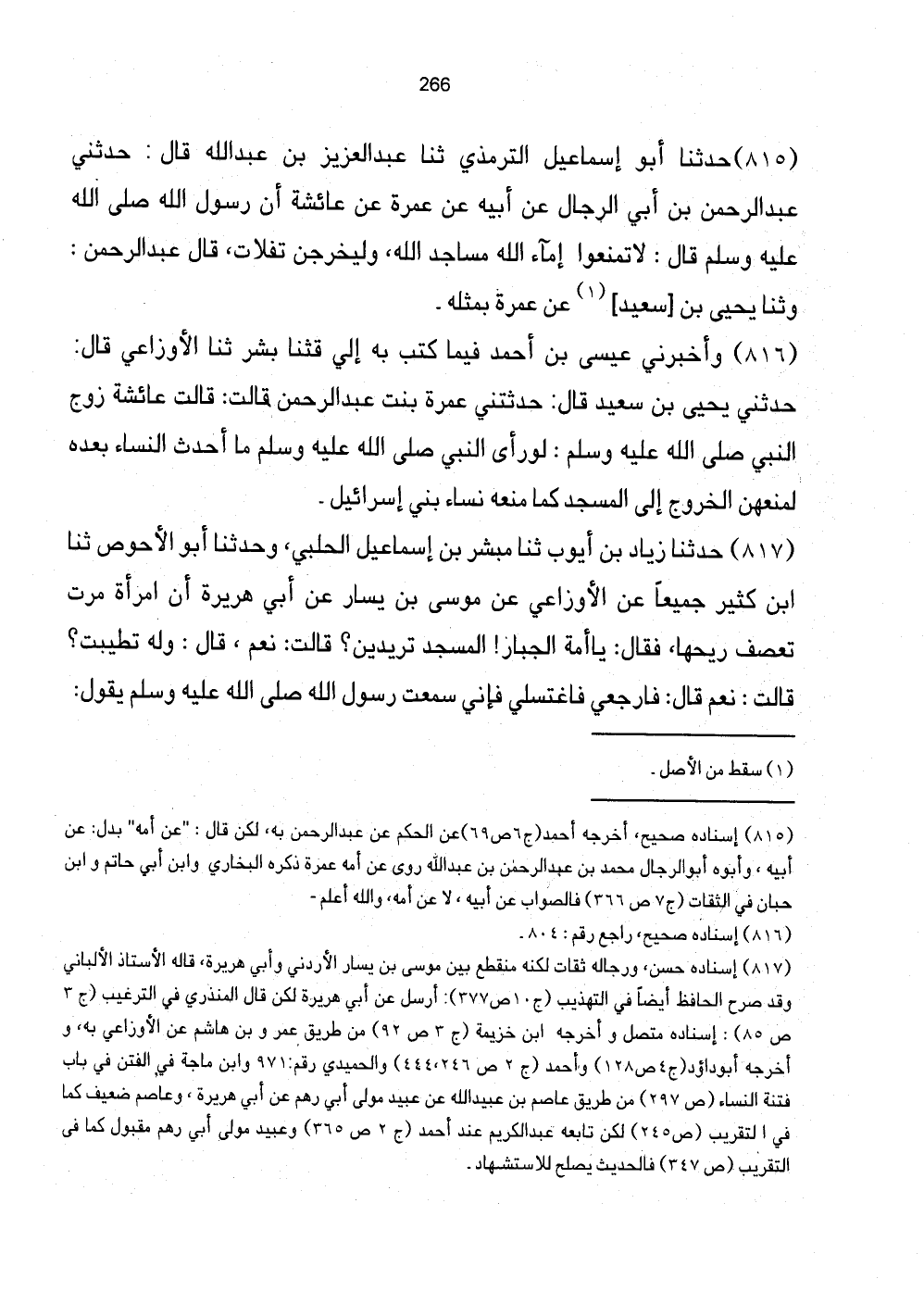 [817] إِسْنَاده حسن، وَرِجَاله ثِقَات لكنه مُنْقَطع بَين مُوسَى بن يسَار الأردني وَأبي هُرَيْرَة، قَالَه الْأُسْتَاذ الألباني وَقد صرح الْحَافِظ أَيْضا فِي التَّهْذِيب (ج10 ص377) : أرسل عَن أبي هُرَيْرَة لَكِن قَالَ الْمُنْذِرِيّ فِي التَّرْغِيب (ج3 ص85) : إِسْنَاده مُتَّصِل وَأخرجه ابْن خُزَيْمَة (ج3 ص92) من طَرِيق عمر وبن هَاشم عَن الْأَوْزَاعِيّ بِهِ، وَأخرجه أَبُو داؤد (ج4 ص128) وَأحمد (ج2 ص246، 444) والْحميدِي رقم: 971 وَابْن مَاجَه فِي الْفِتَن فِي بَاب فتْنَة النِّسَاء (ص297) من طَرِيق عَاصِم بن عبيد الله عَن عبيد مولى أبي رهم عَن أبي هُرَيْرَة، وَعَاصِم ضَعِيف كَمَا فِي التَّقْرِيب (ص245) لَكِن تَابعه عبد الْكَرِيم عِنْد أَحْمد (ج2 ص365) وَعبيد مولى أبي رهم مَقْبُول كَمَا فِي التَّقْرِيب (ص347) فَالْحَدِيث يصلح للاستشهاد.