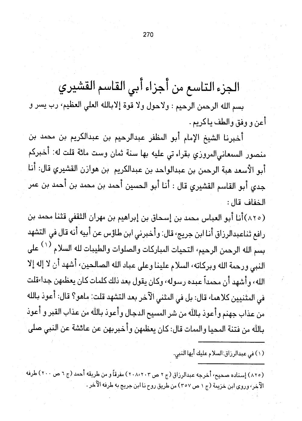 أَخْبَرَنَا الشَّيْخُ الإِمَامُ أَبُو الْمُظَفَّرِ عَبْدُ الرَّحِيمِ بْنُ عَبْدِ الْكَرِيمِ بْنِ مُحَمَّدِ بْنِ مَنْصُورٍ السَّمْعَانِيُّ الْمَرَوْزِيُّ بِقِرَاءَتِي عَلَيْهِ بِهَا سَنَةَ ثَمَانٍ وَسِتِّ مِائَةٍ قُلْتُ لَهُ: أَخْبَرَكُمْ أَبُو الأَسْعَدِ هِبَةُ الرَّحْمَنِ بْنُ عَبْدِ الْوَاحِدِ عَبْدُ الْكَرِيمِ بْنُ هَوَازَنَ الْقُشَيْرِيُّ قَالَ: أَنَا جَدِّي أَبُو الْقَاسِمِ الْقُشَيْرِيُّ قَالَ: أَنَا أَبُو الْحُسَيْنِ أَحْمَدُ بْنُ مُحَمَّدِ بْنِ أَحْمَدَ بْنِ عُمَرَ الْخَفَّافُ قَالَ:
