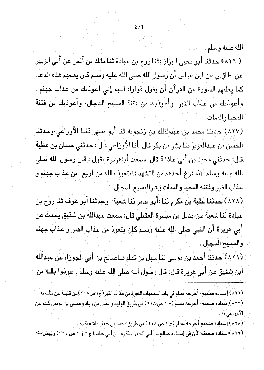 [826] إِسْنَاده صَحِيح، أخرجه مُسلم فِي بَاب اسْتِحْبَاب التَّعَوُّذ من عَذَاب الْقَبْر (ج1 ص218) عَن قُتَيْبَة عَن مَالك بِهِ.